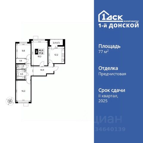 Квартира с кухней-гостиной и тремя спальнями в "Первом квартале". Особенности планировки: окна на две стороны, второй санузел, гардеробная, без отделки, двухуровневая, тёплая лоджия, лоджия, разнесённые спальни, мастер-спальня, терраса, терраса на крыше.