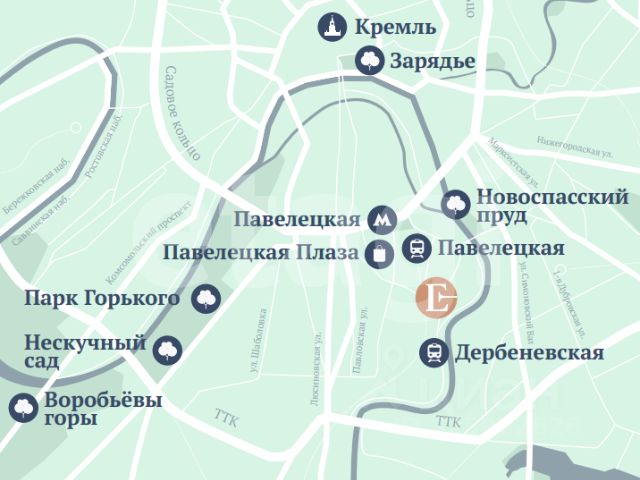 Транспортная доступность: Две станции метро Павелецкая (2) и Павелецкая (5), железнодорожный вокзал Павелецкий, аэроэкспресс и пригородные электрички, развитые автобусные маршруты, комфортный выезд на Садовое кольцо, ТТК и МКАД.
