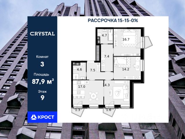 Однокомнатная квартира площадью 75,9 кв.м. на 8 этаже дома бизнес-класса "CRYSTAL Трилогия". Жилой комплекс CRYSTAL Трилогия комфорт в сердце Хорошево-Мнёвников Удобное расположение и транспортная доступность CRYSTAL Трилогия расположен в престижном районе Хорошево-Мнёвники, на улице Генерала Глаголева, всего в нескольких минутах от живописного Серебряного бора и набережной Москвы-реки. Из окон открываются панорамные виды на воду и зелёные зоны, создавая ощущение гармонии с природой. Автомобильная доступность • Звенигородское шоссе и проспект Маршала Жукова быстрый выезд в любую часть города. • 7 км до ТТК, 9 км до МКАД, 10 км до Садового кольца. • Общественный транспорт: • Ближайшая станция метро "Народное ополчение" (2 км). Добраться можно пешком или на автобусе. • В пешей доступности строятся 3 новые станции метро, что повысит транспортную связанность района. Инфраструктура: всё для жизни в шаговой доступности Комплекс входит в состав масштабного квартала Union Park (40 га) это современная городская среда с продуманной инфраструктурой. Образование и развитие: • Лучшие школы Москвы: 1515, 1517, 138, Курчатовская школа. • Детские сады: "Wow Kids Серебряный бор", логопедический "ДАРвиль". • Музыкальная школа им. В. В. Андреева. Медицина и спорт: • Поликлиника "Семейный доктор", медцентр "Мед-Лайт", стоматология. • Спорткомплекс "Серебряный" с бассейном, тренажерным залом и солярием. Магазины и рестораны: • Премиальные магазины: "Азбука вкуса", "ВкусВилл", "Лента", "Магнолия". • Рестораны и кафе: Asia Inn, Wells Home Cafe, рыбный ресторан The Mope. Футуристичная архитектура с продуманным комфортом CRYSTAL Трилогия это уникальный дизайн и эргономичные планировки: Внешний облик: • Кристаллическая архитектура с панорамными эркерами и фасадами в оттенках горького шоколада. • Трехуровневая структура, где на верхнем ярусе вы увидите геометрические эркеры с панорамным остеклением, на среднем уровне расположены квартиры с окнами на 1-2 стороны, а на нижнем отделка австрийским клинкерным кирпичом. Внутреннее пространство: • Светлые входные группы с лаунж-зонами для отдыха и мероприятий. • Подземный паркинг (по машиноместу на квартиру) и кладовые для хранения. • Закрытые дворы с спортивными зонами: • Теннисный корт. • Площадки для воркаута. • Беговые дорожки. • Поле для игровых видов спорта. Квартиры с продуманными планировками • 14 комнатные варианты. • Высокие потолки и панорамное остекление для максимальной инсоляции. • Ровные стены и черновая/чистовая отделка на выбор. • Готовые решения для комфортного заезда.