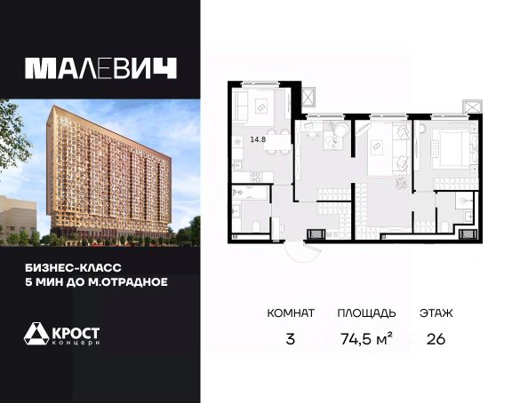 Продаётся 3-к квартира 60.6 кв.м. на 27-м этаже 28 этажного дома. Без отделки. Срок сдачи: 2 кв. 2026 г. Дом МАЛЕВИЧ - это идеальный проект мультифункционального жилого дома, в котором все элементы общественных и личных пространств тщательно продуманы и спроектированы. Здание состоит из двух объемов, один из которых сдвинут относительного другого в горизонтальной плоскости. Авторы идеи придумали совмещать различные слои и цвета бетонов в одной плоскости и рисовать картины не кистью и красками, а различными рецептами бетонов. Картины украсят полы, стены и потолки входных групп, подземного паркинга, мест общего пользования. В Доме МАЛЕВИЧ не один, а сразу 2 парковых общественных пространства, каждое из которых обладает собственной функцией: - внутренний двор только для жителей во внутренней части здания; - открытый парк-вернисаж на ул. Отрадная, доступный для внешних посетителей. Проект дома расширяет возможности вашей квартиры, предоставляя дополнительное пространство для работы, отдыха, учебы, дружеского общения и воспитания детей.Прямая продажа от застройщика ООО СЗ "Аквапарк "Отрадное ".