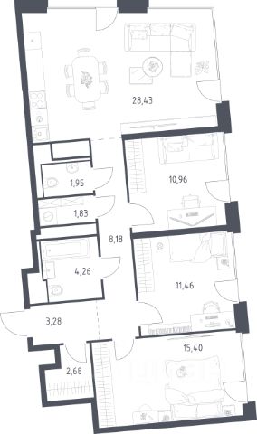 Большая гостиная 24 м², изолированные комнаты 12 и 16 кв.м, кухня 12.9 кв.м и санузлы 5.5. и 1.5 кв.м.