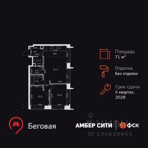 Прямая продажа от застройщика! Успейте забронировать квартиру до повышения стоимости! Жилой Комплекс премиум-класса. Продаётся 3-к квартира номер 8 общей площадью 76.8 кв.м. на 2-м этаже 46 этажного здания. Без отделки. Цена с учётом скидки. Особенности квартиры: - Организуем показ в удобное для вас время! - Мастер-зона с санузлом и гардеробной. Всё для вашего комфорта и удобства, включая личный санузел и гардероб. - Просторная спальня, в которой можно разместить большую кровать. - Угловая планировка - больше пространства для ваших идей. - Увеличенная ширина окна/окон - больше света и визуального простора. - Увеличенное количество окон - дополнительное освещение и свежий воздух. - Нестандартное окно - особенный акцент в вашем интерьере. - Гостевой санузел - комфорт и удобство для ваших гостей. - Ниша под стиральную машину - удобство и экономия пространства. - Евроформат - просторное и удобное жилье с отличной планировкой. - Гибкая планировка - создайте пространство по своему вкусу. - Место для игры/занятия спортом - идеальное пространство для активных детей. - Можно оборудовать рабочее место - комфорт для работы и учёбы. - Линейная кухня - функциональность и практичность в одном решении. - Возможность добавить спальное место - дополнительный комфорт для гостей. - Гардеробная - удобство для хранения и организации вещей. - Ниша под шкаф - компактное и удобное место для вещей. Квартира без отделки. Чистый холст для воплощения интерьера вашей мечты. Информация о комплексе: ЖК "Амбер Сити" - вдохновляющий квартал у Москва-Сити с архитектурой мирового уровня. Здесь кипит жизнь 24/7: парки, инфраструктура и виды на центр без городской суеты. Самодостаточная среда для работы, творчества и семьи в духе лучших районов Нью-Йорка и Гонконга. Транспортная доступность: Квартал с исключительной транспортной доступностью: ключевые точки Москвы в 15-20 минутах. Полное погружение в деловую и культурную жизнь столицы с минимальными затратами времени на дорогу. Общественный транспорт: - Метро "Беговая" - 5 минут пешком - Остановка "2-й Хорошёвский проезд" - 3 минуты пешком - Метро "Звенигородская" (строящаяся) - 10 минут пешком На автомобиле: - Москва-Сити - 10 минут - Звенигородское шоссе - 3 минуты - ТТК - 5 минут - Серебряный бор - 8 минут - Садовое кольцо - 12 минут - Кремль - 20 минут - Шереметьево - 40 минут Внутренняя инфраструктура: ЖК "Амбер Сити": многоуровневый ландшафт на 6 гектарах с зелёным бульваром, объединяющим арт-объекты, водные зоны и архитектурные формы. В закрытых дворах на стилобате - детские площадки с сенсорными элементами, зоны отдыха с креслами и настилами для йоги. Навесы с подогревом и зарядками для зимнего сезона. Активности на любой вкус: настольный теннис, петанк, чтение в тишине на оборудованных скамейках. Продуманное пространство для ежедневного отдыха и игр детей и взрослых.