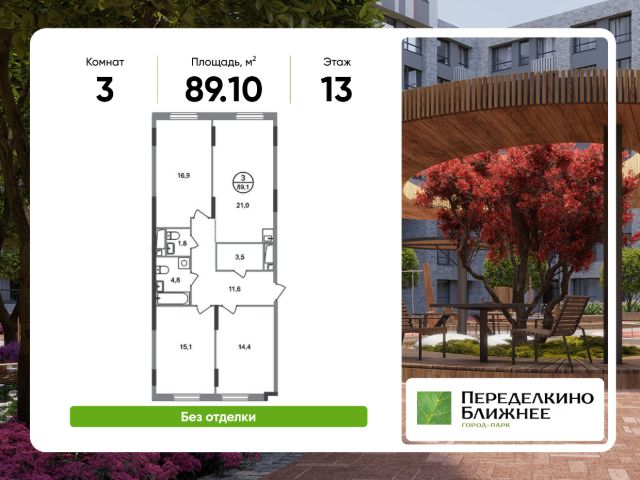 Продается трехкомнатная квартира в городе-парке "Переделкино Ближнее". Общая площадь квартиры - 66,1 кв. м, этаж 1 из 17. Срок сдачи - 1 квартал 2028 года. Тип дома - монолитный. Корпус расположен в новой 13 фазе строительства и состоит из 8 секций с переменной этажностью 12-17 этажей. Все секции без отделки. Около 13 фазы запланировано строительство многоуровневого паркинга на 300 м/мест. 13 фаза имеет уникальное расположение и находится непосредственно на берегу Федосьинского пруда, который является сердцем города-парка "Переделкино Ближнее". Город-парк "Переделкино Ближнее" расположен в 8 км от МКАД по Боровскому шоссе. ТРАНСПОРТНАЯ ДОСТУПНОСТЬ: - 15 минут пешком до станции МЦД-4 "Мичуринец" - 25 минут пешком до станции метро "Рассказовка" Солнцевской линии - 30 минут до центра Москвы - 2026 г. - открытие трассы Солнцево-Бутово-Варшавское шоссе РАЗВИТАЯ СОЦИАЛЬНАЯ ИНФРАСТРУКТУРА: - 7 детских садов, 3 школы - банки, продуктовые магазины, аптеки, фитнес центры, салоны красоты и пр БЛАГОУСТРОЙСТВО: - дворы без машин - игровые зоны и развивающие детские площадки - зоны для созерцательного и медитативного отдыха - зоны для занятий спортом ОСОБЕННОСТИ АРХИТЕКТУРЫ: - высокие потолки от 3,03 м - безбарьерные входные группы - колясочные в каждой входной группе - кладовые помещения расположены на -1 этаже каждой секции - в каждой секции 2 лифта: 1 пассажирский, 1 грузовой - на фасаде предусмотрены корзины для установки кондиционеров АВТОРСКИЙ ДИЗАЙН: Входные группы выполнены по авторскому дизайну, благодаря панорамному остеклению наполнены естественным светом. В каждой входной группе будет располагаться комфортабельная зона ожидания с возможностью зарядить электронные устройства, почтовые ящики, колясочная, акцентные пуфы и столик.