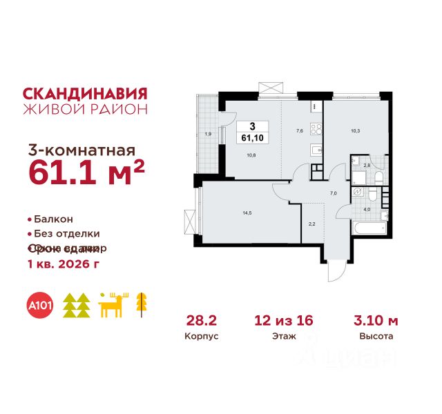 Продается трехкомнатная квартира 294 в новостройке Жилой район "Скандинавия" по адресу Москва, ТиНАО, Новомосковский АО, Сосенское С/П, Коммунарка пос., жилой комплекс Скандинавия, 28.2, район Коммунарка, Новомосковский административный округ, Москва. Общая площадь квартиры - 61.80 кв. м., этаж 2 из 16, секция 5. Тип проекта, по которому построен дом - монолит, компания-застройщик - ООО "А101". Стоимость квартиры - 24148968 Р. ПРЕДЛОЖЕНИЯ ОТ ЗАСТРОЙЩИКА В ФЕВРАЛЕ 2026: Скидки до 10% на все квартиры. Только в офисах продаж до 28 февраля. Ипотека от 13,9 % для всех! На весь срок. "Семейная ипотека" вернулась. Ставка от 3,5 % на весь срок! Без удорожания! Выгодное ипотечное комбо: Ипотека от 2200 р./мес. и от 6 % после рождения ребёнка! Ипотека для всех "Держи пять!" - ставка 5 % на 2 года! *более подробную информацию по скидкам и акциям уточняйте в отделе продаж ЖК "Скандинавия" на границе Бутовского лесопарка (1610 га) - это баланс качественного жилья и сервисов, зелёных пространств для активного и созерцательного отдыха. Выразительная архитектура и цветовая гамма монолитных корпусов комфорт- и бизнес-класса (8-17 этажей) созвучны скандинавским мотивам, органично интегрированы в великолепный природный контекст. Огороженные дворы свободны от машин, в них продуманы места для отдыха и работы на свежем воздухе, озеленение, детские и спортивные площадки. Для прогулок, встреч и районных праздников - площадь Туве Янссон с "сухим" фонтаном, вековыми дубами и единственным в мире памятником писательнице; пешеходный променад 2 км; 3 крупных природных ручья; более 15 км велосипедных и прогулочных дорожек с арт-объектами. Инфраструктура района включает современные школы и детские сады, центр впечатлений, фитнес-клубы, развивающие и творческие центры, магазины, кафе, салоны красоты. На подземных этажах - паркинги и кладовые. Преимущества "Скандинавии": - ст. метро "Потапово" - 100 м от ближайших домов (открыта!) - удобные выезды на трассу Солнцево - Бутово - Варшавское шоссе и ул. Бачуринская - свои школы и детские сады - инфраструктура на первых этажах и рядом с домом - лесопарк, природные водоёмы, прогулочные маршруты