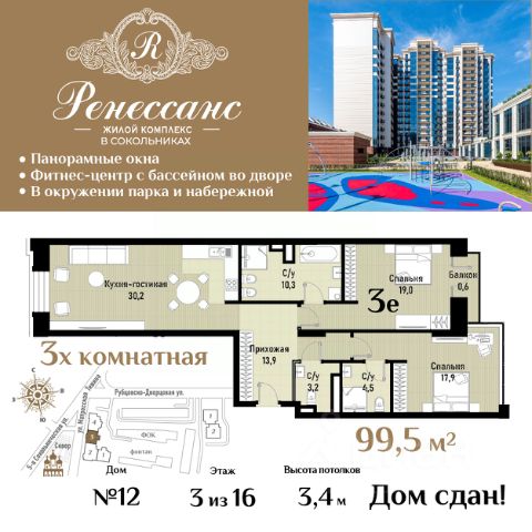Жилой комплекс премиум-класса "Ренессанс" расположен на Рубцовско-Дворцовой улице старинного района Сокольники, в нескольких минутах ходьбы от знаменитого парка "Сокольники" - самого большого парка Москвы и одного из крупнейших в Европе, где круглый год можно прекрасно проводить время всей семьей. Из панорамных окон премиального бренда Schuco открываются завораживающие виды на сияющие в лучах солнца купола церквей и храмов, изумрудную зелень легендарного парка "Сокольники" и национального парка "Лосиный остров", излучины реки Яузы с величественной гранитной набережной, старинные здания, среди которых дворец императрицы Елизаветы Петровны, небоскребы "Москва-Сити", Останкинскую телебашню и приватную, охраняемую территорию комплекса с концепцией "двор без машин", изысканным ландшафтным дизайном, богатой коллекцией растений, пространствами для отдыха с роскошным фонтаном с красивой подсветкой, элегантной перголой, большими шахматами, детскими городками и спортивными площадками. Роскошный интерьер лобби: натуральный испанский мрамор, вертикальный фонтан, репродукции картин эпохи Возрождения, великолепная итальянская люстра ручной работы с подвесками из хрусталя CutCrystal и муранского стекла, иранские ковры и дизайнерская мебель. Лифты премиум-класса ThyssenKrupp. Консьерж-сервис. На этажах мусорокамеры закрытого типа. Из квартиры можно связаться с консьержем по видеодомофону британской компании BAS-IP. Уникальная транспортная доступность: 5 мин. на авто - до ТТК и Русаковской эстакады; 10 мин. - до Садового кольца и улицы Земляной Вал; 15 мин. - до Кремлевской набережной. В шаговой доступности - ст. м. и БКЛ "Сокольники" и "Электрозаводская". Развитая собственная инфраструктура: подземный паркинг, здание фитнес-центра с бассейнами, объекты торговли и сферы услуг. Отличная инфраструктура респектабельного района Сокольники: детские сады, элитные общеобразовательные, музыкальные и спортивные школы, ТЦ, рестораны, банки.