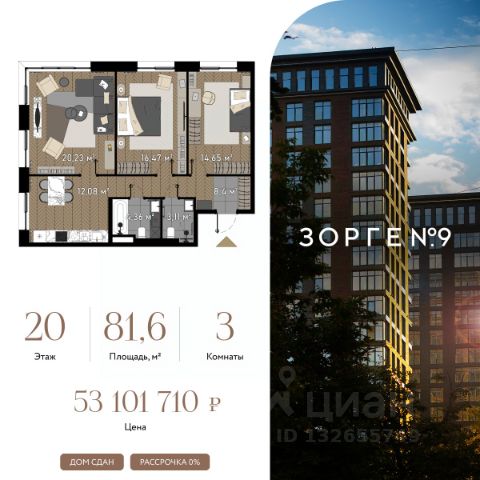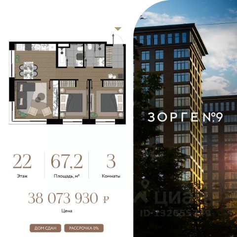 "Зорге 9" — готовые апартаменты бизнес-класса на Ходынке. 10 минут до Москва-Сити. Архитектура: 3 современных корпуса с фасадами в стиле архитектуры Нью-Йорка и с сервисами премиальных отелей, высотой до 23 этажа. Строгие линии, панорамные окна создают ощущение неподдельной роскоши и комфортной жизни в сердце мегаполиса. Проект награжден авторитетной премией European Property Awards. Резиденции: Свободная планировка, небольшая глубина этажа, огромные панорамные окна в пол до 3,6 м и высота потолков до от 3,3 до 4,3 м позволяют реализовать самые смелые концептуальные идеи и создать идеальный интерьер с учетом всех пожеланий. Вдохновляющие виды на город украсят ваш апартамент лучше любой картины. Есть возможность приобретения дизайн-проекта и полной меблировки апартаментов от партнеров девелопера. Расположение: 3 мин. пешком до парка Березовая роща 10 мин. пешком до Ходынского поля 10 мин. до ТЦ Авиапарк 30 минут до Шереметьево 10 мин до Москва-Сити или 1 станция до Москва-Сити 5 минут до ТТК 4 станции метро в шаговой доступности: 6 мин м. Полежаевская (фиолетовая ветка) 7 мин МЦК Зорге (МЦК) 7 мин м. Хорошевская (голубая ветка) 10 мин МЦК Хорошёво (МЦК) Благоустройство: Собственный парк 2 га с амфитеатром и поющими фонтанами. В парке высажено 136 деревьев и более 11 000 кустов и мелких растений из немецких питомников. Площадка для йоги и воркаут-зона со спортивными площадками. Теннисные столы и детский плейхаб Две башни Авторское гранд-лобби В лобби предусмотрена лаундж-зона, чайная с камином, комната для хранения велосипедов и колясок. Доступ по системе FACE ID. В отделке лобби и лифтовых холлов использован декоративный камень итальянского бренда Atlas Concorde Пентхаусы На верхнем уровне комплекса расположены роскошные просторные пентхаусы с высотой потолка до 4,2 метра и панорамными окнами до 3,6 метров, открывающими великолепные виды на столицу. Пентхаусы с выходами на собственные приватные террасы на кровле, площадью от 150 кв. м являются жильем high-уровня, демонстрирующим высокий статус владельца.