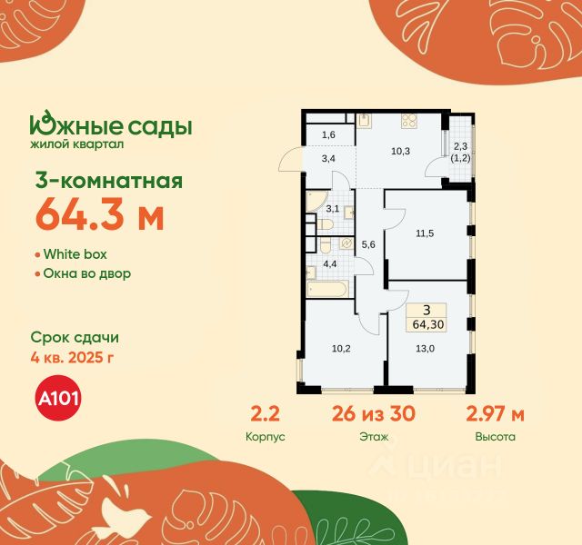 Продается трехкомнатная квартира 212 в новостройке ЖК "Южные Сады" по адресу Москва, ЮЗАО, Южное Бутово, Жилой комплекс "Южные Сады", корп. 2.1. Общая площадь квартиры - 63.20 кв. м., этаж 29 из 30, секция 2. Тип проекта, по которому построен дом - монолит, компания-застройщик - ООО "А101". Стоимость квартиры - 22550392 Р. Срок сдачи - 4 квартал 2025. ПРЕДЛОЖЕНИЯ ОТ ЗАСТРОЙЩИКА В ОКТЯБРЕ 2025: Ипотека от 13,9 % для всех! На весь срок. "Семейная ипотека" вернулась. Ставка от 3,5 % на весь срок! Без удорожания! Выгодное ипотечное комбо: Ипотека от 2200 р./мес. и от 6 % после рождения ребёнка! Ипотека для всех "Держи пять!" - ставка 5 % на 2 года! *более подробную информацию по скидкам и акциям уточняйте в отделе продаж "Южные сады" на юго-западе Москвы - это жилой комплекс монолитных домов с авторской архитектурой, холлами в средиземноморском стиле, колясочными, современными лифтами, паркингом и кладовыми. Южную атмосферу в районе создадут: - перголы с вьющимися растениями, живые изгороди, садовые дорожки - цветущие, плодовые и вечнозелёные растения - стилизация под средиземноморский ландшафт - амфитеатр и игровой кластер со скалодромом. За безопасность "отвечают" закрытые дворы без машин с доступом только для жителей дома, видеонаблюдение, вход по магнитным ключам. Рядом ландшафтный парк "Южное Бутово", Черневские пруды: театры, танцплощадка, крытые беседки, детские и спортивные комплексы, пикниковые зоны, пешеходные дорожки, деревянные настилы. На первых этажах домов: супермаркеты, кафе, банки, фитнес, пекарни. В пешей доступности - торговые центры, гипермаркет, ФОК, действующая инфраструктура. Для семей с детьми - кружки, секции, детские клубы,центры развития, языковые школы. Преимущества "Южных садов": - атмосферное "средиземноморское" благоустройство - 3 станции метро: "Бунинская аллея", "Улица Горчакова", "Новомосковская" - в пределах 1,6 км - в окружении - развитая инфраструктура обжитой локации - в пешей доступности - Бутовский лесопарк Продается 3-комнатная квартира элитные на улице Бартеневская в Москве.