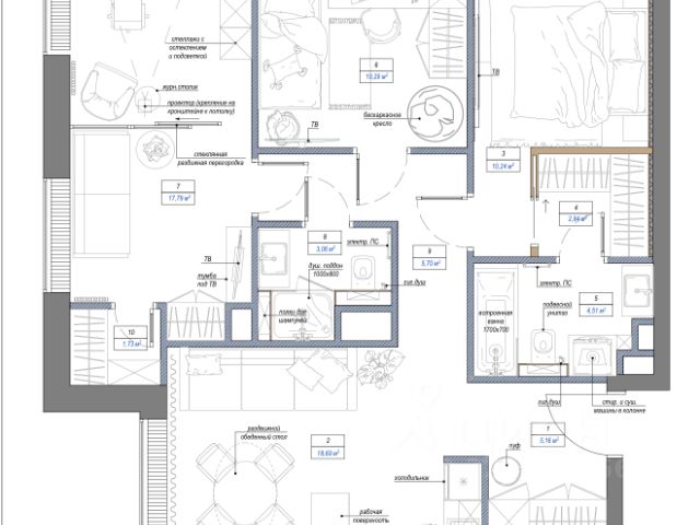 В трех спальнях предусмотрены ТВ и рабочие зоны с интернет розетками , мастер-спальня оснащена гардеробной комнатой.