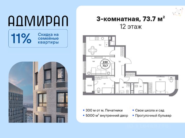 В динамично развивающемся районе Москвы, всего в 300 метрах от метро и в пешей близости от нового городского порта с протяженной набережной 13 км, свободной от автомобилей, продается 3-комнатная квартира площадью 76.60 м². без отделки. Квартира находится в корпусе жилого комплекса бизнес-класса "Адмирал", расположенного по адресу г. Москва, ул. Шоссейная, 4Д. (Застройщик - "Галс Девелопмент"). Новый амбициозный проект "Адмирал" станет частью одного из самых перспективных районов будущего - "Сити-2". В пешей доступности от современных башен Вас ждут живописные Люблинские пруды, 2 усадьбы с уникальной историей и уютный парк "Печатники" у Перервинского плёса. Район имеет отличную транспортную доступность: • 300 метров до станции метро "Печатники"; • Удобная пересадка на БКЛ и станцию МЦД-2; • 10 минут на машине до ТТК; • 15 минут до Садового кольца. Архитектура корпусов отличается динамичностью облика благодаря переменной этажности: высокие башни сочетаются с домами средней этажности. Изящным украшением становятся арочные витражи. Интеллигентный и современный стиль "Адмирала" продолжается в гранд-лобби: пастельные оттенки интерьера и фактурные элементы декора создают атмосферу безмятежного отдыха, особое ощущение простора дарят высокие потолки до 4 м и витражные окна. В домах предусмотрено от трех до шести скоростных лифтов, каждый из них спускается на любой этаж подземного паркинга и обладает удобными сенсорными панелями управления и низким уровнем шума. Благоустроенный двор площадью 5000 кв.м. украсят десятки видов гипоаллергенных растений. Здесь можно совершить приятный променад, по пути заглядывая за свежезаваренным кофе, уединиться за ноутбуком в комфортном коворкинге, занять ребенка играми в двухъярусном плейхабе или помедитировать на специальной площадке для йоги. Мягкий свет декоративных фонарей подчеркнет живописность местности, а чувство безопасности гарантируют круглосуточные системы видеонаблюдения. Дополнительные преимущества: • Высокие потолки от 2,9 до 3,25 м; • Бизнес-центр, школа и детский сад прямо на территории дома; • Подземный двухуровневый паркинг на 1955 машино-мест; • Кладовые помещения в тёплом контуре на 2м этаже; • Стрит-ритейл на первых этажах.