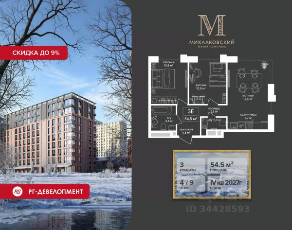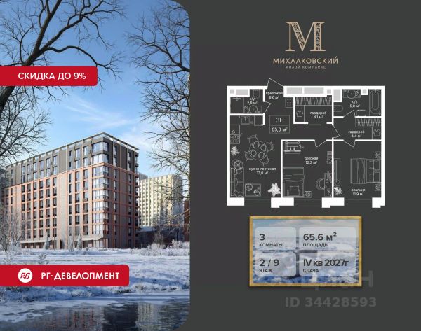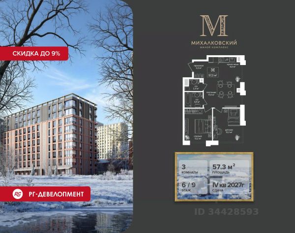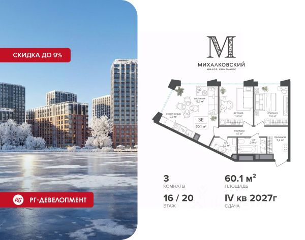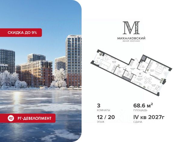 Скидка 9% при покупке квартиры! Продаётся 3-к квартира 63,8 кв.м. в ЖК "Михалковский" на 4-м этаже 18 этажного дома. Ипотека для каждого! Полная стоимость кредита от 13,192% до 17,149%. Ставка от 0,11% в АО "Альфа-Банк", ген. лицензия ЦБ РФ 1326 от 16.01.2015. Ставка фиксируется на первые 12 месяцев, далее полная стоимость кредита от 22,022% до 24,599% ставка 21,59%. Первоначальный взнос — от 20,1% от стоимости квартиры. Срок кредитования — от 4 до 30 лет. Компания "РГ-Девелопмент" предоставляет скидку на квартиры в жилом комплексе. Акция действительна до 15.03.2026 включительно. Для того чтобы воспользоваться предложением, необходимо подписать договор на приобретение недвижимости до 15.03.2026 включительно. Действует программа "Растет семья - растет и квартира". Компания "РГ-Девелопмент" вошла в ТОП-10 девелоперов по объёму введённого жилья в "Старой Москве" по итогам 2025 года. Прямая продажа от застройщика! Квартиры без отделки. Срок сдачи IV кв. 2027г. Особенности проекта: Завораживающие виды Красивое благоустройство Уникальная локация для Москвы (рядом Головинский парк, пруды, усадьба Михалково) Рядом с центром В проекте присутствует: архитектура голландского бюро MLA+, зеленые зоны, транспортная доступность, благоустроенная территория, подземный паркинг, детский сад и выход на Головинский парк с пятью прудами. Название комплекса указывает на одну из его черт - соседство с имением Михалково. Позвольте себе жить в месте, где проводили свой досуг династии Дашковых и Паниных.