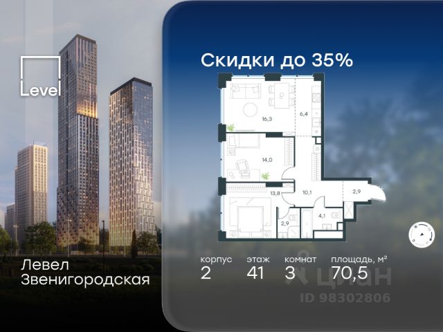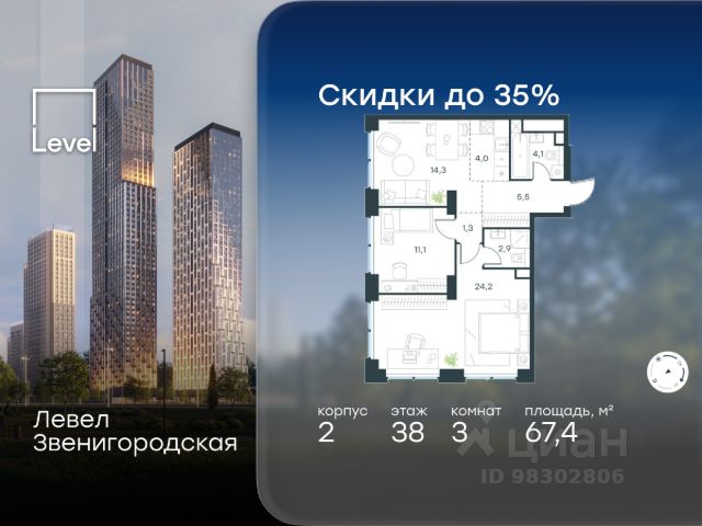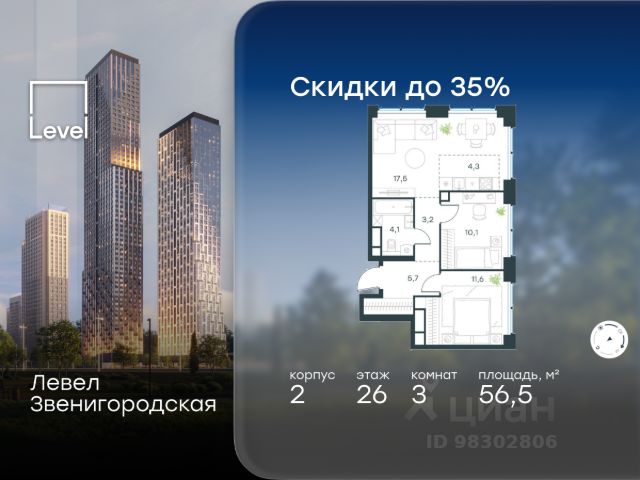 Цена указана с учётом скидки при 100%-й оплате, несубсидированной ипотеке, рассрочке (кроме программы "Рассрочка 0%"). В жилом квартале продаётся 3-комнатная квартира площадью 62.10 кв.м white box. Квартира расположена на 12 этаже 48 этажного корпуса 1 в жилом комплексе комфорт класса Левел Звенигородская (компания Level Group/Левел групп). Отличная транспортная доступность - 5 мин. пешком до метро "Звенигородская" (откроется к окончанию строительства); - 18 мин. пешком до станции МЦК "Хорошёво" и станции БКЛ "Народное ополчение"; - 4 мин. на авто до ТТК; - 8 мин. на авто до Садового кольца; - 15 мин. на авто до Кремля. Продуманный архитектурный проект - Концепция от студии Станислава Михаловского, в основу которой легло единение природы и города; - Двухкамерные стеклопакеты в окнах, алюминиевый и ПВХ профиль - в квартирах тепло зимой и прохладно летом; - С верхних этажей откроются панорамные виды на город, Москву-реку, "Москва-Сити" и Москворецкий парк; - Лобби со всеми удобствами: окна в пол, высокие потолки до 4,7 м, лаунж-зоны, колясочные, гостевые санузлы и мойки для лап животных; - Централизованные водонагреватели гарантируют круглогодичную подачу горячей воды в каждую квартиру. Благоустройство Концепция благоустройства разработана совместно с бюро UNK landscape. Высота башен приближается к 200 метрам - они словно касаются неба. Небесный простор проецируется на территорию двора с помощью подсветки, визуально увеличивая пространство и отражаясь в авторских элементах архитектуры. На территории площадью 0,45 га расположатся: - "Облако событий" - место встреч и общения; - "Облако спорта" - всё для поддержания себя в форме; - "Облако принятия решений" - пространство для работы на свежем воздухе; - "Облако спокойствия" - для отдыха в тишине природы; - "Облако игр" - площадки для подростков и самых маленьких. Инфраструктура В жилом комплексе откроется 21 коммерческое помещение: продуктовые лавки, кафе, салоны красоты, службы доставки и творческие студии. Этап 1 включает строительство двухуровневого подземного паркинга. Всего здесь расположится 351 машино-место, включая семейные места, и 264 кладовых помещения. В распоряжении жителей развитая инфраструктура района: 15 супермаркетов, 5 спортивных объектов, 9 медучреждений, 7 детских садов, 4 школы, 3 благоустроенных парка - всё в шаговой доступности. Инженерия Комфортное перемещение внутри домов будут обеспечивать надёжные лифты с доступом в паркинг с жилых этажей. В каждом корпусе предусмотрено до шести кабин, включая сервисные лифты. Попасть на территорию комплекса можно только по единому ключу доступа. Видеонаблюдение установлено на входах в подъезды, в лобби, в общих зонах, на въезде в паркинг. Гости смогут связаться с жителями дома через входные видеопанели, а управлять доступом на территорию можно через видеодомофон или приложение на телефоне. Элитное жилье - 3-комнатная квартира на шоссе Шелепихинское в Москве.