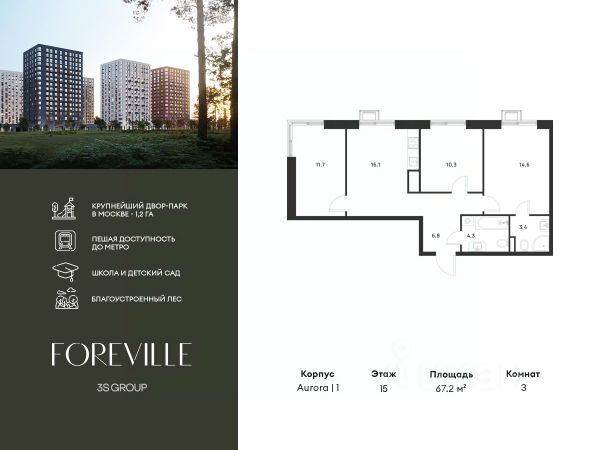 Предчистовая отделка в подарок! Пешая доступность от метро и московская прописка! Продается уютная 3-комн. квартира площадью 71,9 кв.м на 2 этаже 17 этажного жилого комплекса бизнес-класса Foreville от 3S Group. Общая площадь: 71,9 кв.м., жилая: 35,4 кв.м., площадь кухни-гостиной: 15,7 кв.м., высота потолков: 2,72 м., окна выходят во двор и на улицу. Квартира предлагается без отделки, что идеально подходит для воплощения собственного дизайнерского решения. Также доступна опция предчистовой отделки, стоимость которой включается в общую цену квартиры. О проекте: Пространство Комплекс располагает крупнейшим приватным двор-парком в Новой Москве площадью 1,2 Га, предлагая жителям огромное пространство для отдыха, спорта и игр на свежем воздухе. Природный ландшафт Внутренний лесопарк с более чем 183 взрослыми деревьями и 10 320 цветущими кустарниками создает уникальную природную атмосферу для каждого времени года. Игровые и спортивные зоны Обширные площадки с безопасным покрытием, специализированные зоны для детей разных возрастных групп и взрослых, включая воркаут и настольный теннис, способствуют активному и здоровому образу жизни. Экологичность и долговечность Использование натуральных материалов, таких как лиственница, и крупноформатной бетонной плитки для покрытия, подчеркивает стремление проекта к экологичности и устойчивости. Безопасность и уединение Внутренний двор без машин обеспечивает безопасность для детей и спокойствие для взрослых. Территория огорожена и находится под круглосуточным видеонаблюдением. Сохранение времени Благодаря превосходной транспортной доступности и близости к новой станции метро Корниловская, Foreville позволяет жителям экономить время для семьи и отдыха на природе, минимизируя необходимость длительных поездок. Foreville не просто жилье, а целая экосистема для комфортной и гармоничной жизни на свежем воздухе, совмещая преимущества городской инфраструктуры и непосредственную близость к природе.