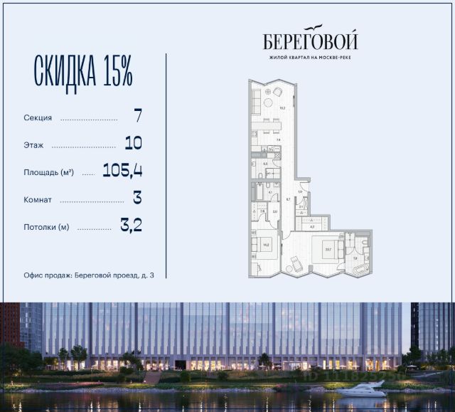 Река. Парк. Сити. Готовый дом в идеальном месте. Продается 3-комнатная квартира на 10 этаже с панорамным остеклением и видом на парковый двор. Береговой — квартал-курорт в центре столицы. Готовый дом на первой линии Москвы-реки. Пешеходная набережная начинается прямо от дома — никаких дорог между вами и рекой. Уникальное сочетание природы парка Фили и ритма Сити. Ключи от нового образа жизни в Береговом: • 12 террас на крышах — ваши виды на Москву с высоты птичьего полета • Пешеходная набережная прямо у дома — ни одной машины между вами и рекой • Лобби с камином, переговорной и консьерж-сервисом • Флагманский Encore Fitness — самый большой в сети (4700 м²) с бассейном, термами и спа-комплексом • Детство на берегу Москвы-реки — в рамках проекта будут построены две школы и детский сад рядом с домом • Гастрономическая набережная: рестораны и премиум-сервисы откроются на первых этажах • Причал "Береговой" рядом с домом — путешествуйте по городу, пока другие стоят в пробках • Безопасность и уединение: контроль доступа на территорию, видеонаблюдение и круглосуточная диспетчерская • Двухуровневый подземный паркинг и кладовые Безупречная квартира для жизни: • Пространство света и воздуха: панорамные окна и высокие потолки 3.2 м • Технологии: центральное кондиционирование и роботизированная система очистки фасадов — вид из окна всегда будет идеальным • Совершенство планировки: просторная кухня-гостиная, минимум коридоров, максимум полезной площади • Квартира без отделки — возможность раскрыть преимущества планировки в вашем уникальном интерьере. Или выбирайте свою версию идеального дома в коллекции планировок: • С изолированными спальнями • Мастер-спальнями с гардеробными и ванными • Видовые ванные комнаты • Функциональные постирочные Эксклюзивные лоты: • Пентахусы с приватными террасами • Двухуровневые пентхаусы Локация, о которой мечтают 15 минут до Сити на машине — и вы в эпицентре деловой жизни. Две станции метро в пешей доступности — когда каждая минута на счету. Утром — пробежка по парку Фили, вечером — прогулка на велосипеде вдоль реки, выходные — водный спорт в Крылатском. Речные трамвайчики вместо такси, зеленые парки и благоприятная экология — привилегии престижного ЗАО Москвы. Условия покупки: выгодные программы покупки от застройщика, специальные условия при полной оплате. Оставляйте заявку на персональную презентацию в шоу-руме.