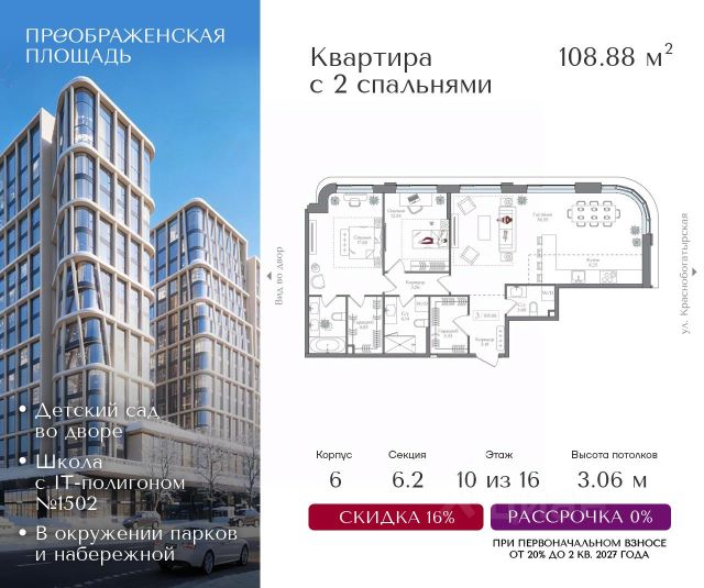 Рассрочка 0% от застройщика. Первоначальный взнос от 20%. Предложение действует до 31 января 2026 года Стоимость указана с учетом скидки 15%. Квартира на 10 этаже в жилом комплексе премиум-класса "Преображенская площадь". Общая площадь: 103.79 кв.м. Проект премиум-класса в историческом районе Москвы. До метро "Преображенская площадь" 3 минуты пешком. Квартиры сдаются без отделки и в свободной планировке, чтобы жители могли оформить пространство с учетом своей индивидуальности. Высота потолков от 3,15м, широкоформатное остекление, 3-5 квартир на этаже. Система Умный дом. Дизайнерские лобби. Внутренний двор 1,5 га функциональное и безопасное пространство для игр, работы и занятий спортом. Пешеходный променад для прогулок. Дома переменной этажности. Есть подземный паркинг. Жилой комлекс находится в окружении парков Сокольники, Черкизовский, Измайловский, заповедника Лосиный остров и ВДНХ, а также вблизи пешеходной набережной. Комфортная удаленность от центра: 7 минут на автомобиле до ТТК, 8 минут до Садового кольца, 25 минут до Кремля.