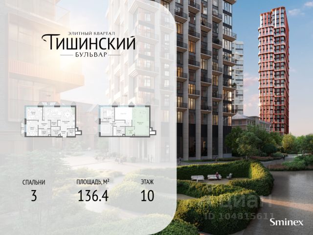 В продаже 3-комнатная квартира квартира в элитном квартале "Тишинский бульвар". Общая площадь квартиры - 105.50 кв.м. Этаж 10 из 14. Корпус Ивовый 6. "Тишинский бульвар" - тихий зелёный элитный квартал на Тишинке, в престижном и комфортном районе центра Москвы. В нём создан уникальный для элитного дома прогулочный бульвар в своём огромном парке 1,9 га. В парке оборудованы зоны для активного и тихого отдыха, крытые галереи, приватные зелёные комнаты, многофункциональная спортивная площадка, воркаут-зона, детская площадка, сухой фонтан, ручей. В пешей доступности Римско-католический кафедральный собор. Всего в полутора километрах от квартала находятся Патриаршие пруды - излюбленное место для летних прогулок, воскресных бранчей и романтических ужинов. Белая площадь расположена ещё ближе - на расстоянии 1,2 километра. Это точка концентрации деловой жизни и модных ресторанов. В "Тишинский бульваре" только для жителей и их гостей создан уникальный для элитного дома прогулочный бульвар в собственном огромном парке площадью 2,1 га, который занимает 70% территории квартала. Бульвар проходит через весь квартал и объединяет в общее пространство три двора: Кленовый, Рябиновый и Ивовый. В парке созданы крытые галереи и приватные зелёные комнаты для отдыха и медитаций в любую погоду. Насыщенное озеленение многолетними растениями с разными периодами цветения сохраняет территорию квартала красивой круглый год. В квартале насыщенная инфраструктура только для жителей, включая Clubhouse. Здесь оборудованы пространства для здорового образа жизни по стандарту FIT LAB: в парке - многофункциональная спортивная площадка, воркаут-зона, место для занятий йогой и медитации; бесплатный фитнес-клуб с бассейном. Для маленьких жителей доступны детская площадка и игровая комната по стандарту KIDS LAB. Дома оснащены самыми полными и лучшими системами.