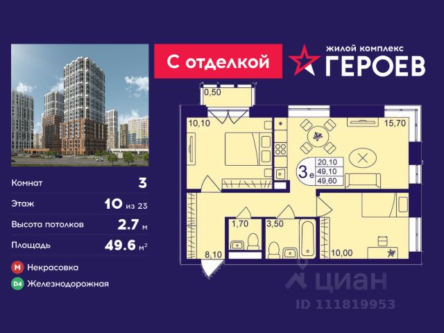 Продаётся 3-комнатная квартира 47.7 кв. м. в жилом комплексе "Героев" в Балашихе, Железнодорожный. Квартира расположена на 10 этаже 611 корпуса. Все квартиры представлены с чистовой отделкой. Вам не нужно тратить время и дополнительные финансы на ремонт или жить в шуме строительных работ - достаточно перевести свои вещи, расставить мебель и всё готово! Жилой квартал "Героев" - это уютный проект для семей с детьми. Всего 40 минут до центра Москвы. В квартале созданы все условия для досуга всех возрастов: игровые и спортивные площадки, места для отдыха и прогулок, магазины, кафе и пункты выдачи. За 15 минут можно дойти от дома до Ольгинского лесопарка - популярного места для прогулок и отдыха на свежем воздухе. Здесь приятно гулять всей семьёй, заниматься спортом или устроить пикник в выходной день. Преимущества: Квартира с готовой отделкой. Пространство полностью подготовлено для жизни: не нужно тратить время и деньги на ремонт или ждать его окончания. После получения ключей достаточно расставить мебель - и можно сразу заезжать и жить. Продуманные и светлые планировки. Просторные кухни-гостиные создают комфортное пространство для отдыха и встреч с близкими. В квартирах предусмотрены удобные гардеробные, благодаря чему легко поддерживать порядок и не перегружать комнаты шкафами. Увеличенное остекление. Большие окна наполняют квартиру естественным светом в течение всего дня, создавая ощущение простора и уюта, а также визуально расширяя пространство и делая интерьер более воздушным. Пешая доступность до станции Железнодорожная (МЦД-4) - дорога займёт не более 30 минут до центра Москвы: станции метро "Курская", "Площадь Ильича" или ТПУ Нижегородская.