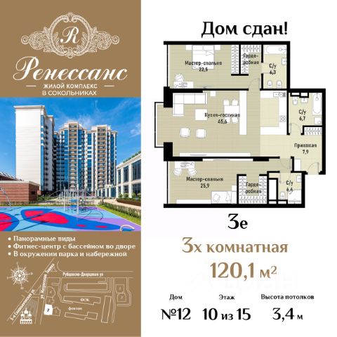 В семейном жилом квартале, расположенном в окружении более 500 га леса и объектов исторического наследия, продается 3-комнатная квартира площадью 95.6 кв. м без отделки. Квартира расположена на 10 этаже 39-этажного корпуса 2.1 жилого квартала бизнес-класса КОД Сокольники от девелопера Новая Эра. Отличная транспортная доступность - 3 мин. пешком до станции МЦД-3 "Митьково"; - 7 мин. пешком до станции метро "Сокольники"; - Удобный выезд на Русаковскую улицу; - 5 мин. на авто до ТТК; - 15 мин. на авто до Садового кольца. Продуманный архитектурный проект - Выразительная архитектура, созданная бюро "Остоженка"; - 70% квартир в квартале - видовые, что позволяет ежедневно наслаждаться панорамами на парк Сокольники, Останкинскую телебашню, исторический центр и Алексеевский монастырь; - 30% квартир - угловые. Увеличенные оконные проемы, панорамное остекление и продуманное расположение комнат усиливают эффект обзорности: гостиные и спальни получают максимум дневного света и живописные виды, которые становятся частью интерьера; - Высокие потолки от 3 метров в типовых планировках; - Дизайнерские лобби от модной студии 211.Studio; - Двухуровневый паркинг с подогреваемой рампой и пологим заездом, подходящим даже для спорткаров; Расположение Семейный жилой квартал КОД Сокольники - это дома бизнес-класса в престижном районе Сокольники. Район отличает хорошая транспортная доступность: несколько минут пешком до станции метро "Сокольники" и платформы МЦД-3 ("Митьково"), регулярные трамвайные и автобусные маршруты, удобный выезд на Русаковскую улицу и Третье транспортное кольцо. До Садового кольца можно доехать за 15 минут. Для пешеходов и велосипедистов в парковой зоне будут оборудованы широкие тротуары и велодорожки, обеспечивая комфортные условия для активного образа жизни. Внутренняя инфраструктура Резидентам будет доступна развитая клубная инфраструктура: собственный фитнес-рум, коворкинг с панорамным видом на парк, игровая комната для детей, пространства для мастер-классов и просторная гостиная, которую можно использовать для отдыха, просмотра кино или проведения мероприятий. На первых этажах жилых домов разместятся объекты стрит-ритейла: кафе, рестораны, магазины и различные сервисы - от аптек и салонов красоты до ателье и барбершопов. Рядом с жилыми корпусами появится деловой квартал с офисами и торговыми площадями на 75 тысяч кв. м, что делает проект привлекательным для тех, кто ценит возможность жить и работать поблизости. Благоустройство Центральным элементом квартала станет благоустроенный двор-парк площадью 3 га с собственным прудом и зелеными зонами для прогулок и отдыха. В границах двора предусмотрены современные игровые и спортивные площадки: мультифункциональная зона воркаута, площадки для волейбола и стритбола, площадки для пилатеса и йоги, скалодром, а также беговые и веломаршруты. В состав проекта войдет образовательный центр, включающий детский сад для 350 малышей, а также школу на 650 учеников.