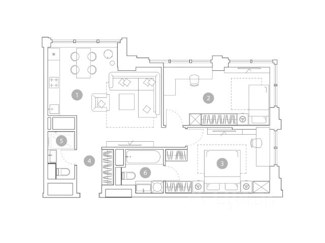 2 санузла: в одном умывальник, унитаз и душ, во втором умывальник/унитаз/биде/ванная с гидромассажем. Оборудована кладовка/постирочная (со стиральной и сушильной машинами) и накопительным водонагревателем.