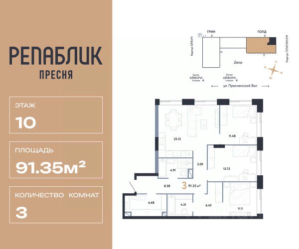 В продаже 3-комнатная квартира квартира в элитном квартале "Тишинский бульвар". Общая площадь квартиры - 127.80 кв.м. Этаж 10 из 11. Корпус К4С2. "Тишинский бульвар" - тихий зелёный элитный квартал на Тишинке, в престижном и комфортном районе центра Москвы. В нём создан уникальный для элитного дома прогулочный бульвар в своём огромном парке 1,9 га. В парке оборудованы зоны для активного и тихого отдыха, крытые галереи, приватные зелёные комнаты, многофункциональная спортивная площадка, воркаут-зона, детская площадка, сухой фонтан, ручей. В пешей доступности Римско-католический кафедральный собор. Всего в полутора километрах от квартала находятся Патриаршие пруды - излюбленное место для летних прогулок, воскресных бранчей и романтических ужинов. Белая площадь расположена ещё ближе - на расстоянии 1,2 километра. Это точка концентрации деловой жизни и модных ресторанов. В "Тишинский бульваре" только для жителей и их гостей создан уникальный для элитного дома прогулочный бульвар в собственном огромном парке площадью 2,1 га, который занимает 70% территории квартала. Бульвар проходит через весь квартал и объединяет в общее пространство три двора: Кленовый, Рябиновый и Ивовый. В парке созданы крытые галереи и приватные зелёные комнаты для отдыха и медитаций в любую погоду. Насыщенное озеленение многолетними растениями с разными периодами цветения сохраняет территорию квартала красивой круглый год. В квартале насыщенная инфраструктура только для жителей, включая Clubhouse. Здесь оборудованы пространства для здорового образа жизни по стандарту FIT LAB: в парке - многофункциональная спортивная площадка, воркаут-зона, место для занятий йогой и медитации; бесплатный фитнес-клуб с бассейном. Для маленьких жителей доступны детская площадка и игровая комната по стандарту KIDS LAB. Дома оснащены самыми полными и лучшими системами.