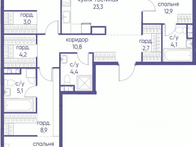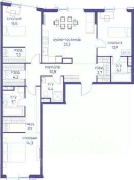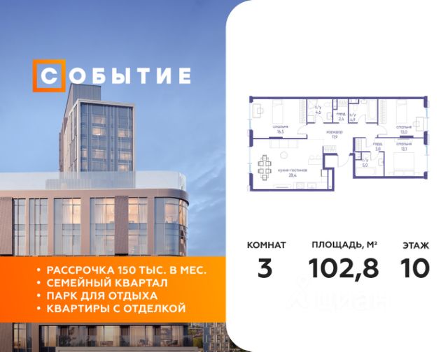 В продаже 3-к квартира от застройщика. Общая площадь 82.80, жилая 41.90, кухня 25.5. Квартира расположена на 10 этаже жилого квартала "Событие-6", корпус 2, 4. Квартира без отделки. Срок сдачи: 4 кв. 2029 года. СОБЫТИЕ.6 — финальный дом парк-квартала СОБЫТИЕ на Мосфильмовской. Переезжайте в уже сформированный квартал с готовой инфраструктурой и парком! Премиальный жилой комплекс в престижном районе Москвы предлагает стильную архитектуру, продуманное благоустройство и великолепно разнообразие общественных пространств. Свой парк прямо возле дома! Архитектура Архитектура СОБЫТИЯ.6 выполнена в ультрасовременном стиле московским бюро Atrium на основе дизайн-кода британских архитекторов LDA Design и UHA London. Дом отличает оригинальная геометрия фасадов, большое остекление и высокие лобби (до 6,2 м) с авторской мебелью и светильниками. Расположение Мосфильмовская улица (Раменки) — один из престижных районов Москвы. Близость к историческому и деловому центру, природным зонам Запада столицы. Транспортная доступность: • 10 мин до Москва-Сити и ТТК; • 15 мин до Садового кольца; • 25 мин до аэропорта Внуково; • 7-10 мин до станций метро "Аминьевская" и "Мичуринский проспект". Инфраструктура: • парк "Событие" (12 га, финалист конкурса Правительства Москвы) с беговыми (1,5 км) и велодорожками (2,7 км), экотропой (1,6 км), площадками, лекторием; • школа, детский сад, магазины, салоны красоты, рестораны (к моменту заселения); • мультидвор с игровыми и спортивными площадками, мини-бульваром; • общественная терраса на 10-м этаже (коворкинг, лаунж); • Закрытые общественные пространства: детская комната, спортивный зал, коворкинг, лаунж-зоны. Паркинг 256 мест для жителей (48 — для электромобилей), 24 гостевых (5 — для электромобилей), мойки колес, кладовые, зоны для велосипедов. Окружение Парки и заповедники (Воробьёвы горы, Матвеевский лес и др.), МГУ, театр им. Н. И. Сац, стадион "Лужники". Безопасность Видеонаблюдение, контроль доступа, видеодомофоны, консьерж-сервис 24/7, системы пожарной безопасности и мультисервисная оптическая сеть.