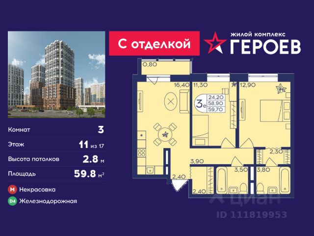 Продаётся 3-комнатная квартира 54.3 кв. м. в жилом комплексе "Героев" в Балашихе, Железнодорожный. Квартира расположена на 11 этаже 407 корпуса. Все квартиры представлены с чистовой отделкой. Вам не нужно тратить время и дополнительные финансы на ремонт или жить в шуме строительных работ - достаточно перевести свои вещи, расставить мебель и всё готово! Жилой квартал "Героев" - это уютный проект для семей с детьми. Всего 40 минут до центра Москвы. В квартале созданы все условия для досуга всех возрастов: игровые и спортивные площадки, места для отдыха и прогулок, магазины, кафе и пункты выдачи. За 15 минут можно дойти от дома до Ольгинского лесопарка - популярного места для прогулок и отдыха на свежем воздухе. Здесь приятно гулять всей семьёй, заниматься спортом или устроить пикник в выходной день. Преимущества: Квартира с готовой отделкой. Пространство полностью подготовлено для жизни: не нужно тратить время и деньги на ремонт или ждать его окончания. После получения ключей достаточно расставить мебель - и можно сразу заезжать и жить. Продуманные и светлые планировки. Просторные кухни-гостиные создают комфортное пространство для отдыха и встреч с близкими. В квартирах предусмотрены удобные гардеробные, благодаря чему легко поддерживать порядок и не перегружать комнаты шкафами. Увеличенное остекление. Большие окна наполняют квартиру естественным светом в течение всего дня, создавая ощущение простора и уюта, а также визуально расширяя пространство и делая интерьер более воздушным. Пешая доступность до станции Железнодорожная (МЦД-4) - дорога займёт не более 30 минут до центра Москвы: станции метро "Курская", "Площадь Ильича" или ТПУ Нижегородская.