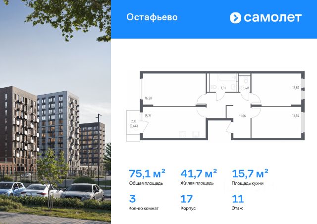 Продажа 3-комнатных квартир на 11 этаже рядом с метро Остафьево