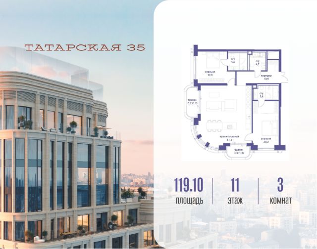 Продажа 3-комнатных квартир на 11 этаже рядом с метро Павелецкая