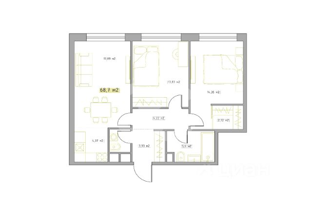 В квартире 2 спальни (23 и 16 кв.м), кухня-гостиная, 2 санузла, один с ванной 7,7 кв.м в мастер-спальне, второй 5,5 кв.м с душевой. Гардеробная 8,1 кв.м в коридоре, можно сразу убрать все вещи, вторая 3 кв м, в мастер спальне.