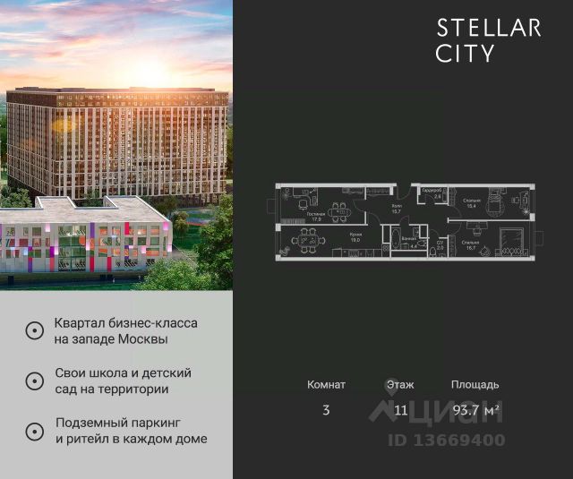 Продается квартира от надежного застройщика Tashir Estate в квартале бизнес-класса Stellar City в ЗАО Москвы. Площадь квартиры составляет: 80.3 кв. м, потолки: 2.9 м Квартира находится на 11 этаже, 4 корпуса жилого квартала Stellar City — микрогорода будущего на орбите Москвы. Stellar City — квартал в ЗАО Москвы вблизи инновационного центра Сколково. В окружении — 11 парков и природных зон, в том числе Долина реки Сетунь, Мещерский лес и парк развлечений The Rink. Город в городе Чтобы дом и инфраструктура вокруг отвечала динамичному лайфстайлу жителя мегаполиса, в основу проекта легла концепция город в городе, которая позволяет решать все бытовые вопросы in-home. В квартале будут возведены школа и детский сад, воркаут-зоны, променад, вело и беговые дорожки, детские площадки для каждого корпуса, а также коммерция на первых этажах для ежедневных покупок. Все необходимое — на расстоянии нескольких шагов. Изящные и лаконичные лобби Авторский дизайн, натуральные материалы в отделке и безупречный интерьер вне времени. Лобби и холлы в проекте бизнес-класса Stellar City ничем не отличаются от входных групп в премиум-сегменте благодаря качественным европейским материалам в отделке, стильному дизайну, консьерж-сервису и уютной зоне ожидания с журнальными столиками и мягкой мебелью. Комфорт и безопасность Закрытая территория, охрана, система СКУД, специально разработанное мобильное приложение дома для резидентов и подземный паркинг с круглосуточным наблюдением и доступом с помощью автоматического считывания номера авто.