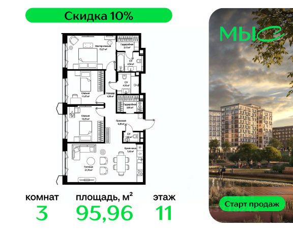 Прямая продажа от застройщика. Продаётся 3-к квартира общей площадью 95.96 м² без отделки в премиальном жилом комплексе "МЫС" на 11-м этаже 12 этажного дома. Квартира расположена в корпусе "Сибирь". ЖК "МЫС" - идеальное место для тех, кто хочет объединить городскую жизнь с близостью к природе. Здесь каждый найдет формат жилья на свой вкус: многоквартирные и клубные дома для больших семей, ценящих приватность и простор, частные дома и таунхаусы для истинных фанатов загородной жизни, которые не готовы отказываться от городского комфорта. Расположение: - 2 мин. до скоростной трассы М1 и Минского шоссе; - 10 мин. до МКАД; - 20 мин. до делового центра "Москва-Сити"; - 25 мин. до ст. метро "Рассказовка"; - 28 мин. до аэропорта "Внуково". Благоустройство: - авторские лобби; - уютные зоны ожидания и библиотека; - велосипедные и лыжные маршруты; - собственная набережная и парк; - лаунж-зоны в окружении природы; - беседки у очага; - дворец спорта площадью 20 000 м²; - термальный комплекс с тремя бассейнами; - 4 теннисных и падел-корта; - 6 сквош-кортов; - многофункциональный спортзал; - скейт-парк; - просторная площадь для прогулок с фонтаном; - детский клуб с творческими секциями; - гастро-доминанта; - кафе у пруда, рестораны, ритейл. Окружение - соседство с лесным фондом; - школа на 1250 мест и 2 детских сада на 350 и 255 мест; - резерват "Долина реки Вяземки", Дубковский и Подушкинский леса, парк "Рассказовка", Мещерский парк.Компания MR Group предлагает своим клиентам специальные условия приобретения квартир в рамках программ ипотечного кредитования от банков-партнеров.