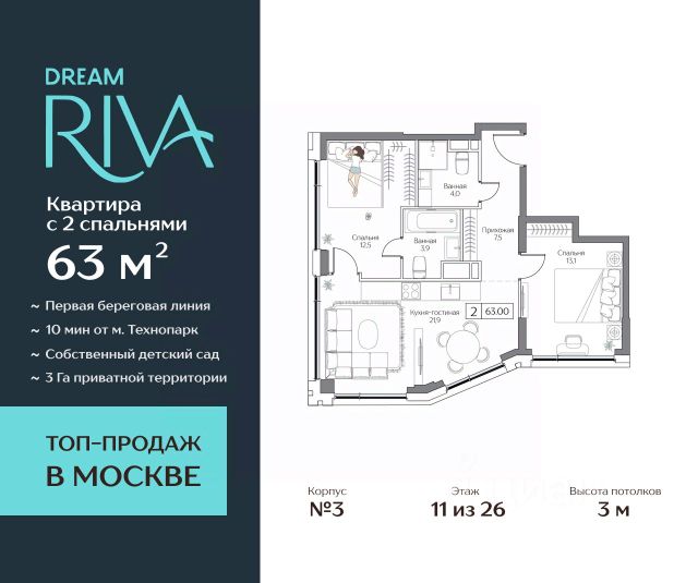 Увеличенный объем панорамного остекления создает неповторимое ощущения воздушности пространства! Двор-набережная с видами на гладь реки и кроны деревьев. Премиальный квартал DREAM RIVA — авторская архитектура в курортной концепции, воплощающей силу природных стихий в каждой детали оформления и благоустройства. Продаётся Квартира с 2 спальнями квартира на 11 этаже 26-этажного дома (3 корпус). Общая площадь: 63 кв.м. Высота потолков от 3 м. Формат приватного досуга и эксклюзивные привилегии в DREAM RIVA с приоритетным доступом для резидентов: - Первая линия Москвы-реки с открытыми видами на воду и город; - 3 Га приватного прибрежного парка с зонами для спорта и йоги; - Открытый солярий; - Школа и собственный детский сад; - Многофункциональные детские игровые площадки и детское кафе с игровой комнатой; - Клубная гостиная и lounge-бар. Локация вне конкуренции — инфраструктура полуострова предлагает всё, что нужно для размеренной жизни, работы, отдыха и развлечений: - Благоустроенная набережная с гастрогалереей; - Парк аттракционов Остров Мечты (в торговой части: рестораны, кафе, супермаркет, магазины, салон красоты, йога-студия и многое другое); - 44 Га ландшафтных парков для прогулок, спорта, пикников; - Пляжный комплекс Dream Beach Club со множеством бассейнов, ресторанов, баров и развлечений для любого возраста; - Яхт-клуб; - Вейк-парк; - Кинотеатр под открытым небом и многое другое. Удобная транспортная доступность: - Центр рядом: 15 минут до Садового кольца на авто, 20 минут до Сити или Кремля; - В 5 минутах прогулочным шагом — станция метро "Технопарк"; - Южный речной вокзал. Наши менеджеры будут рады провести для Вас консультацию и подробнее рассказать о проекте. Успейте купить на лучших условиях!