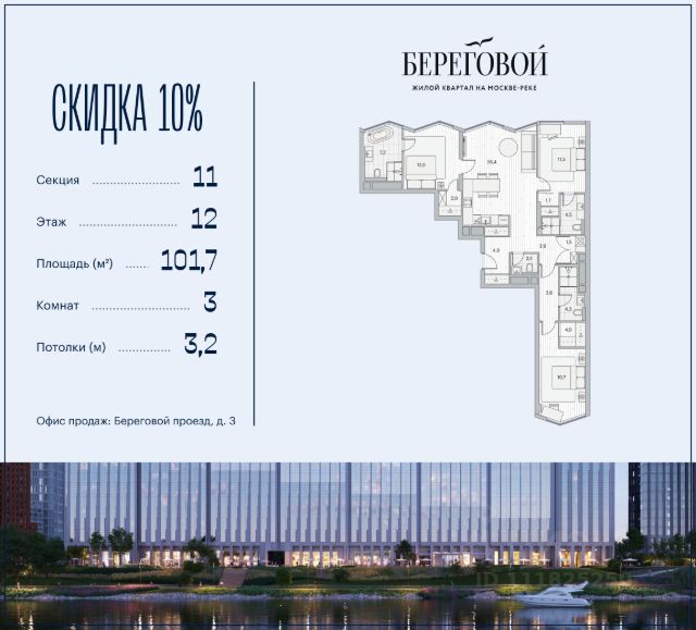 Река. Парк. Сити. Готовый дом в идеальном месте. Продается 3-комнатная квартира на 12 этаже с панорамным остеклением и видом на Береговой пр-д. Береговой — квартал-курорт в центре столицы. Готовый дом на первой линии Москвы-реки. Пешеходная набережная начинается прямо от дома — никаких дорог между вами и рекой. Уникальное сочетание природы парка Фили и ритма Сити. Ключи от нового образа жизни в Береговом: • 12 террас на крышах — ваши виды на Москву с высоты птичьего полета • Пешеходная набережная прямо у дома — ни одной машины между вами и рекой • Лобби с камином, переговорной и консьерж-сервисом • Флагманский Encore Fitness — самый большой в сети (4700 м²) с бассейном, термами и спа-комплексом • Детство на берегу Москвы-реки — в рамках проекта будут построены две школы и детский сад рядом с домом • Гастрономическая набережная: рестораны и премиум-сервисы откроются на первых этажах • Причал "Береговой" рядом с домом — путешествуйте по городу, пока другие стоят в пробках • Безопасность и уединение: контроль доступа на территорию, видеонаблюдение и круглосуточная диспетчерская • Двухуровневый подземный паркинг и кладовые Безупречная квартира для жизни: • Пространство света и воздуха: панорамные окна и высокие потолки 3.2 м • Технологии: центральное кондиционирование и роботизированная система очистки фасадов — вид из окна всегда будет идеальным • Совершенство планировки: просторная кухня-гостиная, минимум коридоров, максимум полезной площади • Квартира без отделки — возможность раскрыть преимущества планировки в вашем уникальном интерьере. Или выбирайте свою версию идеального дома в коллекции планировок: • С изолированными спальнями • Мастер-спальнями с гардеробными и ванными • Видовые ванные комнаты • Функциональные постирочные Эксклюзивные лоты: • Пентахусы с приватными террасами • Двухуровневые пентхаусы Локация, о которой мечтают 15 минут до Сити на машине — и вы в эпицентре деловой жизни. Две станции метро в пешей доступности — когда каждая минута на счету. Утром — пробежка по парку Фили, вечером — прогулка на велосипеде вдоль реки, выходные — водный спорт в Крылатском. Речные трамвайчики вместо такси, зеленые парки и благоприятная экология — привилегии престижного ЗАО Москвы. Условия покупки: выгодные программы покупки от застройщика, специальные условия при полной оплате. Оставляйте заявку на персональную презентацию в шоу-руме.