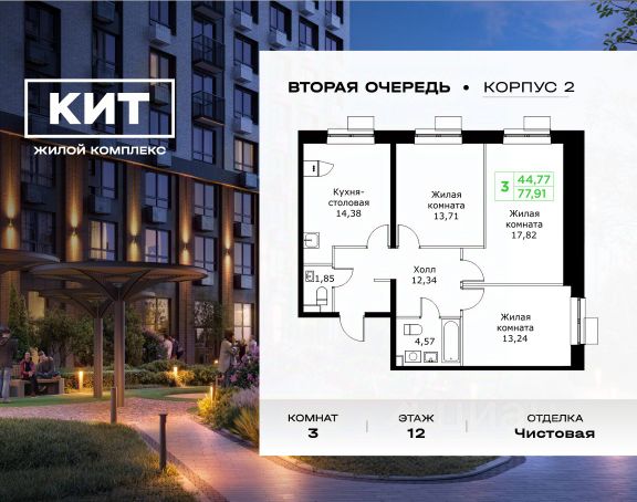 Продаётся 3-к квартира 77.91 кв.м. с чистовой отделкой в ЖК "КИТ2" на 12-м этаже 25 этажного дома.Жилой комплекс "Кит 2" спроектирован в урбанистической концепции "Город в Городе". Объект бизнес-класса предлагает рациональный подход к набору опций, необходимых для гармоничной жизни. Проект представляет собой два корпуса, которые образуют единую приватную территорию. Ее доминантой является двор с красивым ландшафтным дизайном и различными зонами, ориентированными на интересы жителей разного возраста. При создании пространства в приоритет ставился комфорт жителей. В шаговой доступности находятся: торговый центр, рестораны, кинотеатры, спортивный зал, образовательные учреждения и множество других объектов в сфере услуг. Преимущества проекта: - 3 корпуса для приватной жизни - Видовые характеристики (просматриваются Москва - Сити и Останкинская телебашня) - Широкая квартирография по всем типам квартир - Увеличенное остекление - 3 варианта отделки: БОРДО, СТОКГОЛЬМ, ОСЛО - Богатая развлекательная инфраструктура - Высокий уровень безопасности территории Расположение комплекса: - 2,2 км до Волковского шоссе - 2,8 км до Ярославского шоссе - 5,7 км до МКАД - 5 минут пешком до ж/д станции "Мытищи" и Автовокзала - 18 минут до станции метро "Комсомольская" - 30 минут до станции метро "Медведково"