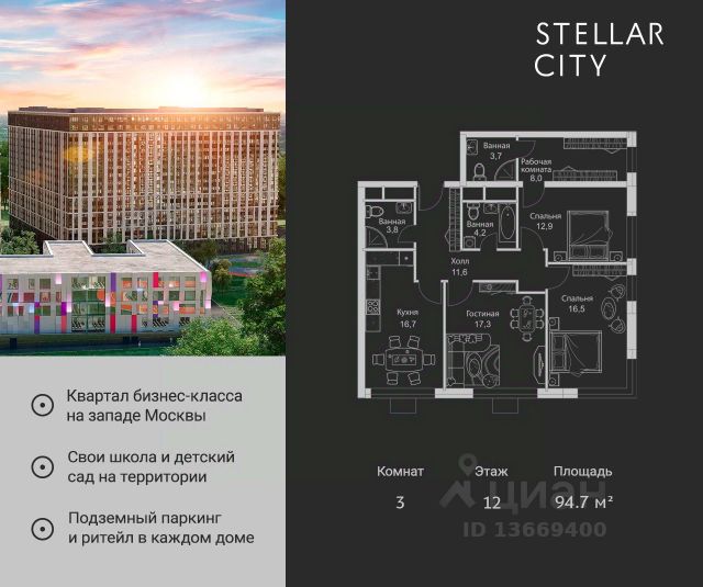 Продается квартира от надежного застройщика Tashir Estate в квартале бизнес-класса Stellar City в ЗАО Москвы. Площадь квартиры составляет: 94.7 кв. м, потолки: 2.9 м Квартира находится на 12 этаже, 4 корпуса жилого квартала Stellar City — микрогорода будущего на орбите Москвы. Stellar City — квартал в ЗАО Москвы вблизи инновационного центра Сколково. В окружении — 11 парков и природных зон, в том числе Долина реки Сетунь, Мещерский лес и парк развлечений The Rink. Город в городе Чтобы дом и инфраструктура вокруг отвечала динамичному лайфстайлу жителя мегаполиса, в основу проекта легла концепция город в городе, которая позволяет решать все бытовые вопросы in-home. В квартале будут возведены школа и детский сад, воркаут-зоны, променад, вело и беговые дорожки, детские площадки для каждого корпуса, а также коммерция на первых этажах для ежедневных покупок. Все необходимое — на расстоянии нескольких шагов. Изящные и лаконичные лобби Авторский дизайн, натуральные материалы в отделке и безупречный интерьер вне времени. Лобби и холлы в проекте бизнес-класса Stellar City ничем не отличаются от входных групп в премиум-сегменте благодаря качественным европейским материалам в отделке, стильному дизайну, консьерж-сервису и уютной зоне ожидания с журнальными столиками и мягкой мебелью. Комфорт и безопасность Закрытая территория, охрана, система СКУД, специально разработанное мобильное приложение дома для резидентов и подземный паркинг с круглосуточным наблюдением и доступом с помощью автоматического считывания номера авто.