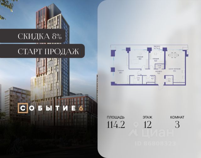 Скидка до 8% действует до 27.02.2026 г. при 100% оплате и не субсидированной ипотеке. Продаётся 3-комнатная квартира от застройщика: общая площадь 114.20 м², жилая 56.50 м², кухня 27.40 м², 12-й этаж, жилой квартал "Событие-6", корпус 2 (секция 5) Срок сдачи: 1 квартал 2029 года. Позвоните сейчас и забронируйте квартиру! Продуманный до деталей. Созданный для жизни, полной счастливых событий. Парк-квартал СОБЫТИЕ - это жизнь класса премиум в престижном районе на Мосфильмовской улице. Архитектура мирового уровня. Выигрышное расположение на границе природного комплекса "Долина реки Раменки". Все для комфортной жизни и досуга: от детсадов и школ до ресторанов и медцентров. И новая точка притяжения - уже готовый парк "Событие" с пространствами активности для всех возрастов и интересов. Особенности квартала: • "Парящие" мосты и парк под облаками - уникальный дом с самыми завораживающими видами из окон "в пол" • Собственный парк - сразу за порогом! • Архитектурная концепция от известных международных бюро LDA Design и UHA London • Инфраструктура "тапочной доступности": в кафе, школу, магазин - за пару минут! • Внутренний двор - настоящее продолжение вашего дома: закрытая охраняемая территория без машин, развивающие детские площадки, воркауты-зоны для тех, кто хочет быть в форме, площади для праздников и посиделок с соседями.