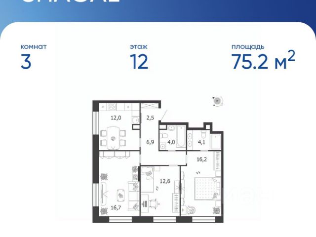 Продается квартира 265, по адресу г. Москва, ЮАО, Даниловский, ул. Автозаводская, вл. 23/75, корпус Жилой квартал Shagal, 3 очередь, 5 этап, корпус 5 в Shagal на 12 этаже, с площадью 75.2 м2.