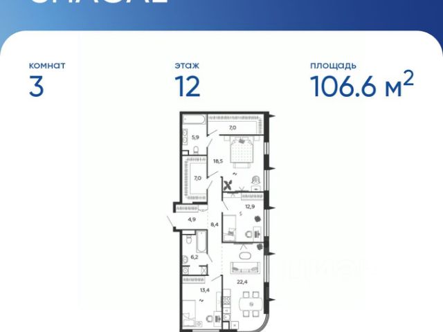 Продается квартира 411, по адресу Москва, внутригородская территория, муниципальный округ Даниловский, набережная Марка Шагала, земельный участок 15, корпус Жилой квартал Shagal, 2 очередь, 1 этап, корпус 7 в Shagal на 12 этаже, с площадью 106.6 м2.