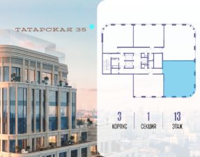 Продается просторная квартира площадью 128.90 м2 в жилом комплексе ТАТАРСКАЯ, 35. Квартира находится в 1 секции корпуса 3. Этаж 13-й из 24. Квартира без чистовой отделки, с просторной кухней 41.90 м2. Жилая площадь 44.70 м2. Высота потолка от 3.50. ТАТАРСКАЯ, 35 - новая архитектурная доминанта Замоскворечья, достопримечательность на фотопанорамах исторического центра Москвы. Элитный дом, созданный для тех, кто умеет смотреть далеко вперед, мыслить масштабно и воплощать собственный сценарий жизни. Вдохновляющие прогулки по променаду набережной, в уютных переулках, в парке "Зарядье", в Михайловском саду и Репинском сквере. Наслаждение высоким искусством в Третьяковской галерее, Доме Музыки, театральном музее им. А.А. Бахрушина, театре на Малой Ордынке. За окнами - Кремль, высотка на Котельнической, панорамы Замоскворечья и острова Балчуг, огни Садового кольца. Собственные спорт-румы, детская, репетиторская, бьюти-пространства, деловое пространство с коворкингом, переговорной и сигарной. Собственный трехуровневый фитнесс-центр с бассейном, тренажерным залом, сауной, хаммамом, массажным кабинетом. Площадь двора - 1,8 га, половина территории покрыта деревьями, кустарниками и лужайками. Дом расположен внутри Садового кольца - отсюда в считанные минуты можно добраться до важнейших мест столицы: достопримечательностей и парков, театров и ресторанов, деловых и административных центров. 7 минут до Кремля на автомобиле, 15 минут до Третьяковской галереи и 8 минут до Садового кольца пешком. Планировочные решения и визуализации предварительны, возможны изменения.