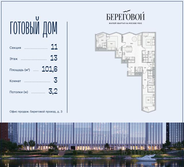 Река. Парк. Сити. Готовый дом в идеальном месте. Продается 3-комнатная квартира на 13 этаже с панорамным остеклением и видом на Береговой пр-д. Береговой — квартал-курорт в центре столицы. Готовый дом на первой линии Москвы-реки. Пешеходная набережная начинается прямо от дома — никаких дорог между вами и рекой. Уникальное сочетание природы парка Фили и ритма Сити. Ключи от нового образа жизни в Береговом: • 12 террас на крышах — ваши виды на Москву с высоты птичьего полета • Пешеходная набережная прямо у дома — ни одной машины между вами и рекой • Лобби с камином, переговорной и консьерж-сервисом • Флагманский Encore Fitness — самый большой в сети (4700 м²) с бассейном, термами и спа-комплексом • Детство на берегу Москвы-реки — в рамках проекта будут построены две школы и детский сад рядом с домом • Гастрономическая набережная: рестораны и премиум-сервисы откроются на первых этажах • Причал "Береговой" рядом с домом — путешествуйте по городу, пока другие стоят в пробках • Безопасность и уединение: контроль доступа на территорию, видеонаблюдение и круглосуточная диспетчерская • Двухуровневый подземный паркинг и кладовые Безупречная квартира для жизни: • Пространство света и воздуха: панорамные окна и высокие потолки 3.2 м • Технологии: центральное кондиционирование и роботизированная система очистки фасадов — вид из окна всегда будет идеальным • Совершенство планировки: просторная кухня-гостиная, минимум коридоров, максимум полезной площади • Квартира без отделки — возможность раскрыть преимущества планировки в вашем уникальном интерьере. Или выбирайте свою версию идеального дома в коллекции планировок: • С изолированными спальнями • Мастер-спальнями с гардеробными и ванными • Видовые ванные комнаты • Функциональные постирочные Эксклюзивные лоты: • Пентахусы с приватными террасами • Двухуровневые пентхаусы Локация, о которой мечтают 15 минут до Сити на машине — и вы в эпицентре деловой жизни. Две станции метро в пешей доступности — когда каждая минута на счету. Утром — пробежка по парку Фили, вечером — прогулка на велосипеде вдоль реки, выходные — водный спорт в Крылатском. Речные трамвайчики вместо такси, зеленые парки и благоприятная экология — привилегии престижного ЗАО Москвы. Условия покупки: выгодные программы покупки от застройщика, специальные условия при полной оплате. Оставляйте заявку на персональную презентацию в шоу-руме.