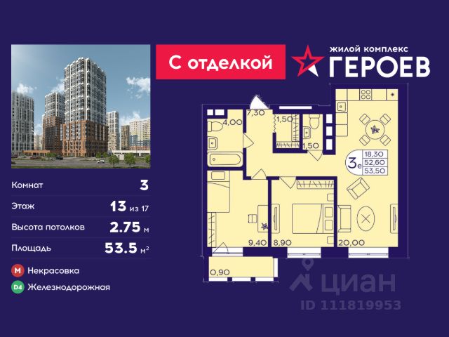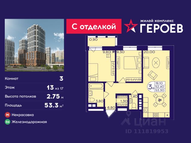 Продаётся 3-комнатная квартира 50 кв. м. в жилом комплексе "Героев" в Балашихе, Железнодорожный. Квартира расположена на 13 этаже 610 корпуса. Все квартиры представлены с чистовой отделкой. Вам не нужно тратить время и дополнительные финансы на ремонт или жить в шуме строительных работ - достаточно перевести свои вещи, расставить мебель и всё готово! Жилой квартал "Героев" - это уютный проект для семей с детьми. Всего 40 минут до центра Москвы. В квартале созданы все условия для досуга всех возрастов: игровые и спортивные площадки, места для отдыха и прогулок, магазины, кафе и пункты выдачи. За 15 минут можно дойти от дома до Ольгинского лесопарка - популярного места для прогулок и отдыха на свежем воздухе. Здесь приятно гулять всей семьёй, заниматься спортом или устроить пикник в выходной день. Преимущества: Квартира с готовой отделкой. Пространство полностью подготовлено для жизни: не нужно тратить время и деньги на ремонт или ждать его окончания. После получения ключей достаточно расставить мебель - и можно сразу заезжать и жить. Продуманные и светлые планировки. Просторные кухни-гостиные создают комфортное пространство для отдыха и встреч с близкими. В квартирах предусмотрены удобные гардеробные, благодаря чему легко поддерживать порядок и не перегружать комнаты шкафами. Увеличенное остекление. Большие окна наполняют квартиру естественным светом в течение всего дня, создавая ощущение простора и уюта, а также визуально расширяя пространство и делая интерьер более воздушным. Пешая доступность до станции Железнодорожная (МЦД-4) - дорога займёт не более 30 минут до центра Москвы: станции метро "Курская", "Площадь Ильича" или ТПУ Нижегородская.
