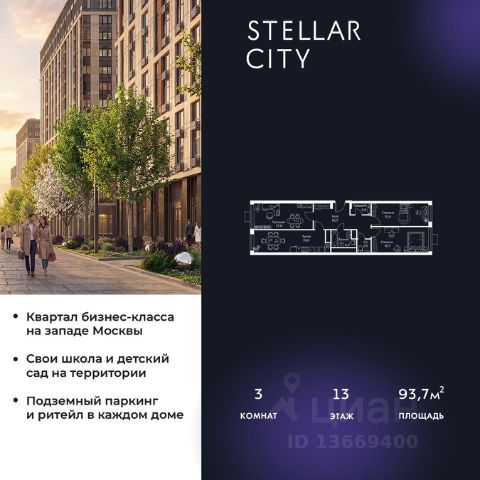 Продается квартира от надежного застройщика Tashir Estate в квартале бизнес-класса Stellar City в ЗАО Москвы. Площадь квартиры составляет: 80.3 кв. м, потолки: 3.1 м Квартира находится на 13 этаже, 4 корпуса жилого квартала Stellar City — микрогорода будущего на орбите Москвы. Stellar City — квартал в ЗАО Москвы вблизи инновационного центра Сколково. В окружении — 11 парков и природных зон, в том числе Долина реки Сетунь, Мещерский лес и парк развлечений The Rink. Город в городе Чтобы дом и инфраструктура вокруг отвечала динамичному лайфстайлу жителя мегаполиса, в основу проекта легла концепция город в городе, которая позволяет решать все бытовые вопросы in-home. В квартале будут возведены школа и детский сад, воркаут-зоны, променад, вело и беговые дорожки, детские площадки для каждого корпуса, а также коммерция на первых этажах для ежедневных покупок. Все необходимое — на расстоянии нескольких шагов. Изящные и лаконичные лобби Авторский дизайн, натуральные материалы в отделке и безупречный интерьер вне времени. Лобби и холлы в проекте бизнес-класса Stellar City ничем не отличаются от входных групп в премиум-сегменте благодаря качественным европейским материалам в отделке, стильному дизайну, консьерж-сервису и уютной зоне ожидания с журнальными столиками и мягкой мебелью. Комфорт и безопасность Закрытая территория, охрана, система СКУД, специально разработанное мобильное приложение дома для резидентов и подземный паркинг с круглосуточным наблюдением и доступом с помощью автоматического считывания номера авто.