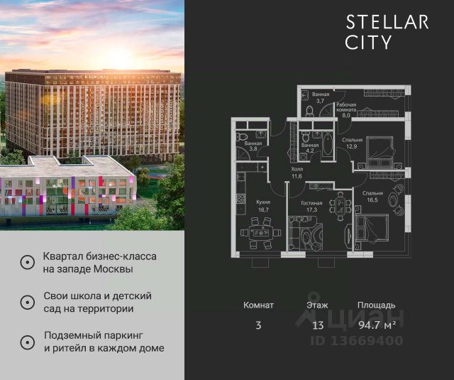 Продается квартира от надежного застройщика Tashir Estate в квартале бизнес-класса Stellar City в ЗАО Москвы. Площадь квартиры составляет: 100.5 кв. м, потолки: 2.9 м Квартира находится на 13 этаже, 4 корпуса жилого квартала Stellar City — микрогорода будущего на орбите Москвы. Stellar City — квартал в ЗАО Москвы вблизи инновационного центра Сколково. В окружении — 11 парков и природных зон, в том числе Долина реки Сетунь, Мещерский лес и парк развлечений The Rink. Город в городе Чтобы дом и инфраструктура вокруг отвечала динамичному лайфстайлу жителя мегаполиса, в основу проекта легла концепция город в городе, которая позволяет решать все бытовые вопросы in-home. В квартале будут возведены школа и детский сад, воркаут-зоны, променад, вело и беговые дорожки, детские площадки для каждого корпуса, а также коммерция на первых этажах для ежедневных покупок. Все необходимое — на расстоянии нескольких шагов. Изящные и лаконичные лобби Авторский дизайн, натуральные материалы в отделке и безупречный интерьер вне времени. Лобби и холлы в проекте бизнес-класса Stellar City ничем не отличаются от входных групп в премиум-сегменте благодаря качественным европейским материалам в отделке, стильному дизайну, консьерж-сервису и уютной зоне ожидания с журнальными столиками и мягкой мебелью. Комфорт и безопасность Закрытая территория, охрана, система СКУД, специально разработанное мобильное приложение дома для резидентов и подземный паркинг с круглосуточным наблюдением и доступом с помощью автоматического считывания номера авто.