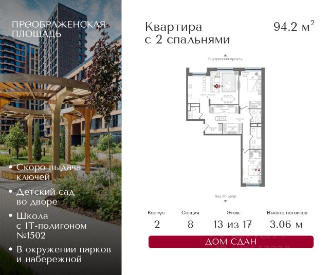 Рассрочка 0% от застройщика. Первоначальный взнос от 20%. Предложение действует до 31 декабря 2025 года Квартира на 13 этаже в жилом комплексе премиум-класса "Преображенская площадь". Общая площадь: 81.35 кв.м. Проект премиум-класса в историческом районе Москвы. До метро "Преображенская площадь" 3 минуты пешком. Квартиры сдаются без отделки и в свободной планировке, чтобы жители могли оформить пространство с учетом своей индивидуальности. Высота потолков от 3,15м, широкоформатное остекление, 3-5 квартир на этаже. Система Умный дом. Дизайнерские лобби. Внутренний двор 1,5 га функциональное и безопасное пространство для игр, работы и занятий спортом. Пешеходный променад для прогулок. Дома переменной этажности. Есть подземный паркинг. Жилой комлекс находится в окружении парков Сокольники, Черкизовский, Измайловский, заповедника Лосиный остров и ВДНХ, а также вблизи пешеходной набережной. Комфортная удаленность от центра: 7 минут на автомобиле до ТТК, 8 минут до Садового кольца, 25 минут до Кремля.