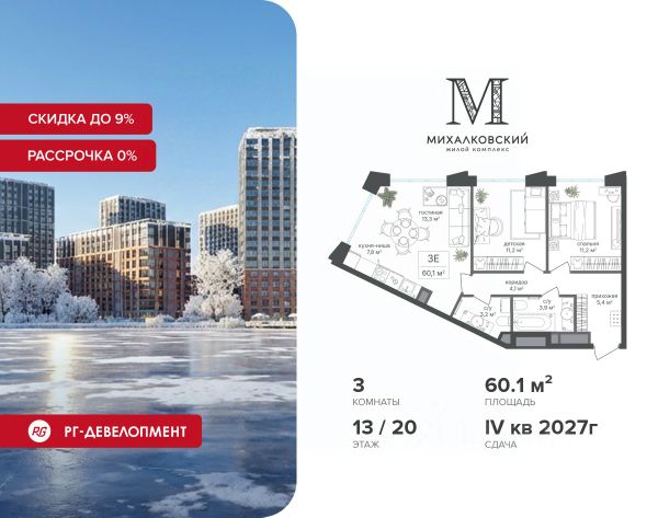 Новогодняя скидка 9% при покупке квартиры! Продаётся 3-к квартира 67,4 кв.м. в ЖК "Михалковский" на 13-м этаже 20 этажного дома. Компания "РГ-Девелопмент" предоставляет новогоднюю скидку на квартиры в жилом комплексе. Акция действительна с 12.09.2024 по 31.12.2025 включительно. Для того чтобы воспользоваться предложением, необходимо подписать договор на приобретение недвижимости до 31.12.2025 включительно. Рассрочка 0% + Скидка 5%. При приобретении дольщиком квартиры в любом из двух данных корпусов с использованием способа оплаты "Рассрочка 0%", у покупателя также есть право воспользоваться скидкой в размере 5% от полной стоимости квартиры. Условия программы рассрочки: Первый платеж составляет 20% от стоимости объекта и вносится при заключении ДДУ. Второй платеж в размере 20% от стоимости объекта вносится по истечении 12 месяцев со дня подписания ДДУ. Оставшаяся сумма, в размере 60%, выплачивается за месяц до планового срока ввода ЖК в эксплуатацию, то есть не позднее 31.05.2027. Действует на приобретение квартир в корп. 2, 7. Действует программа "Растет семья - растет и квартира". Прямая продажа от застройщика! Старт продаж новых корпусов. Квартиры без отделки. Срок сдачи IV кв. 2027г. Особенности проекта: Завораживающие виды Красивое благоустройство Уникальная локация для Москвы (рядом Головинский парк, пруды, усадьба Михалково) Рядом с центром В проекте присутствует: архитектура голландского бюро MLA+, зеленые зоны, транспортная доступность, благоустроенная территория, подземный паркинг, детский сад и выход на Головинский парк с пятью прудами. Название комплекса указывает на одну из его черт - соседство с имением Михалково. Позвольте себе жить в месте, где проводили свой досуг династии Дашковых и Паниных.