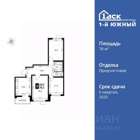 Прямая продажа от застройщика! Жилой Комплекс класса Комфорт Плюс. Продаётся 3-к квартира номер 169 общей площадью 78.2 кв.м. на 14-м этаже 24 этажного здания. Отделка Whitebox. Цена с учётом скидки. Особенности квартиры: - МЦД-5 в пешей доступности - Квартал с южным садом - Свои 3 детских сада и 2 большие школы - Просторная спальня, в которой можно разместить большую кровать. - Распашная планировка - отличное сочетание удобства и свободы. - Гостевой санузел - комфорт и удобство для ваших гостей. - Просторная кухня - место для семейных ужинов и кулинарных экспериментов. - Просторная мягкая зона - комфорт и уют для отдыха всей семьи. - Возможность добавить спальное место - дополнительный комфорт для гостей. - Ниша под шкаф - компактное и удобное место для вещей. - Просторная лоджия - идеальное место для уютных вечеров. Квартира с предчистовой отделкой (White box). Вам не придется заниматься черновыми и трудоёмкими работы, а чистовую отделку и дизайн - сделайте на свой вкус. Информация о комплексе: Одно из преимуществ проектов 1- ДСК большие застекленные лоджии. Другое преимущество честный евро-формат. Во всем проекте предусмотрена система Умный дом. В состав устанавливаемого пакета устройств входит: WiFi реле для управления группами потребителей, беспроводной кран перекрытия с эл. приводом, беспроводной сенсор протечки, Яндекс Станция Мини. Его расположение можно назвать удачным за счет транспортной доступности и близости к природным объектам. По соседству лес, а в каждом дворе плодовые деревья. Весной квартал окутывает бело-розовое облако: это цветут яблони, груши, сливы. К августу в воздух наполняется ароматом созревших плодов. Зимой среди покрытых инеем деревьев протянулась лыжня. Транспортная доступность: - Общественный транспорт: Действующая ж/д станция Булатниково (в перспективе будущая МДЦ D5) в пешей доступности, всего 10-12 минут. - Личный автотранспорт: Удобный выезд на трассу М4-Дон в сторону Москвы и области 850 м, до МКАД - 1 км Внутренняя инфраструктура: Красивые продуманные подъезды - еще одно преимущество проекта 1-й Южный. Вход в сквозные подъезды есть и с улицы, и со двора. Благодаря сплошному остеклению в них всегда светло и уютно. Подъезды расположены на уровне земли, поэтому и молодым родителям с коляской, и жильцам с ограниченными возможностями вход и выход неудобств не доставят. В помещении предусмотрено место под стойку ресепшен с выводом инженерных сетей. Если жильцы решат на общем собрании, что необходим охранник или консьерж, организовать для них рабочее место можно быстро и с минимальными затратами. В подъездах предусмотрены уборные для детей и взрослых. Колясочные в каждом подъезде позволяют поддерживать порядок и чистоту на этажах. На случай прогулки с четвероногим питомцем в непогоду в подъездах устроены лапомойки. Во дворах и на общественных территориях 1-ого Южного столько всего интересного для юных обитателей. Собственные 3 детских сада и 2 больших школы буквально под о