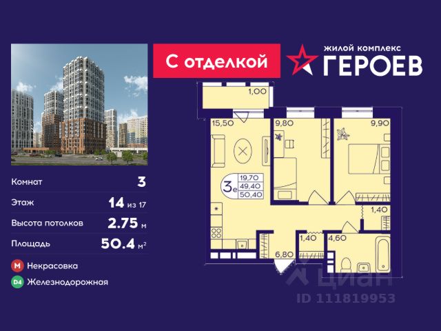 Продаётся 3-комнатная квартира 54.8 кв. м. в жилом комплексе "Героев" в Балашихе, Железнодорожный. Квартира расположена на 14 этаже 411 корпуса. Все квартиры представлены с чистовой отделкой. Вам не нужно тратить время и дополнительные финансы на ремонт или жить в шуме строительных работ - достаточно перевести свои вещи, расставить мебель и всё готово! Жилой квартал "Героев" - это уютный проект для семей с детьми. Всего 40 минут до центра Москвы. В квартале созданы все условия для досуга всех возрастов: игровые и спортивные площадки, места для отдыха и прогулок, магазины, кафе и пункты выдачи. За 15 минут можно дойти от дома до Ольгинского лесопарка - популярного места для прогулок и отдыха на свежем воздухе. Здесь приятно гулять всей семьёй, заниматься спортом или устроить пикник в выходной день. Преимущества: Квартира с готовой отделкой. Пространство полностью подготовлено для жизни: не нужно тратить время и деньги на ремонт или ждать его окончания. После получения ключей достаточно расставить мебель - и можно сразу заезжать и жить. Продуманные и светлые планировки. Просторные кухни-гостиные создают комфортное пространство для отдыха и встреч с близкими. В квартирах предусмотрены удобные гардеробные, благодаря чему легко поддерживать порядок и не перегружать комнаты шкафами. Увеличенное остекление. Большие окна наполняют квартиру естественным светом в течение всего дня, создавая ощущение простора и уюта, а также визуально расширяя пространство и делая интерьер более воздушным. Пешая доступность до станции Железнодорожная (МЦД-4) - дорога займёт не более 30 минут до центра Москвы: станции метро "Курская", "Площадь Ильича" или ТПУ Нижегородская.