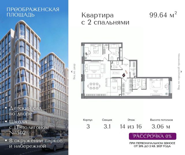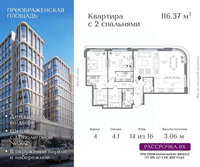 Рассрочка 0% от застройщика. Первоначальный взнос от 20%. Предложение действует до 31 января 2026 года Квартира на 14 этаже в жилом комплексе премиум-класса "Преображенская площадь". Общая площадь: 116.37 кв.м. Проект премиум-класса в историческом районе Москвы. До метро "Преображенская площадь" 3 минуты пешком. Квартиры сдаются без отделки и в свободной планировке, чтобы жители могли оформить пространство с учетом своей индивидуальности. Высота потолков от 3,15м, широкоформатное остекление, 3-5 квартир на этаже. Система Умный дом. Дизайнерские лобби. Внутренний двор 1,5 га функциональное и безопасное пространство для игр, работы и занятий спортом. Пешеходный променад для прогулок. Дома переменной этажности. Есть подземный паркинг. Жилой комлекс находится в окружении парков Сокольники, Черкизовский, Измайловский, заповедника Лосиный остров и ВДНХ, а также вблизи пешеходной набережной. Комфортная удаленность от центра: 7 минут на автомобиле до ТТК, 8 минут до Садового кольца, 25 минут до Кремля.