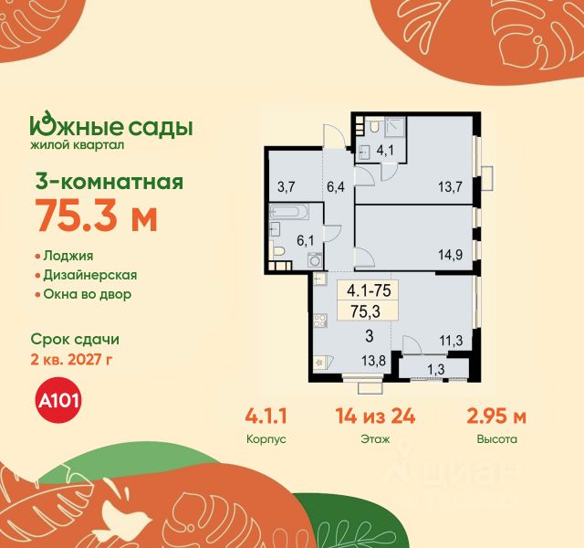 Продается трехкомнатная квартира 75 в новостройке ЖК "Южные Сады" по адресу Москва, ЮЗАО, Южное Бутово, ул. Бартеневская, д. 16. Общая площадь квартиры - 75.30 кв. м., этаж 14 из 24, секция 1. Тип проекта, по которому построен дом - монолит, компания-застройщик - ООО "А101". Стоимость квартиры - 27377574 Р. Срок сдачи - 2 квартал 2027. ПРЕДЛОЖЕНИЯ ОТ ЗАСТРОЙЩИКА В ФЕВРАЛЕ 2026: Скидки до 10% на все квартиры. Только в офисах продаж до 28 февраля. Ипотека от 13,9 % для всех! На весь срок. "Семейная ипотека" вернулась. Ставка от 3,5 % на весь срок! Без удорожания! Выгодное ипотечное комбо: Ипотека от 2200 р./мес. и от 6 % после рождения ребёнка! Ипотека для всех "Держи пять!" - ставка 5 % на 2 года! *более подробную информацию по скидкам и акциям уточняйте в отделе продаж "Южные сады" на юго-западе Москвы - это жилой комплекс монолитных домов с авторской архитектурой, холлами в средиземноморском стиле, колясочными, современными лифтами, паркингом и кладовыми. Южную атмосферу в районе создадут: - перголы с вьющимися растениями, живые изгороди, садовые дорожки - цветущие, плодовые и вечнозелёные растения - стилизация под средиземноморский ландшафт - амфитеатр и игровой кластер со скалодромом. За безопасность "отвечают" закрытые дворы без машин с доступом только для жителей дома, видеонаблюдение, вход по магнитным ключам. Рядом ландшафтный парк "Южное Бутово", Черневские пруды: театры, танцплощадка, крытые беседки, детские и спортивные комплексы, пикниковые зоны, пешеходные дорожки, деревянные настилы. На первых этажах домов: супермаркеты, кафе, банки, фитнес, пекарни. В пешей доступности - торговые центры, гипермаркет, ФОК, действующая инфраструктура. Для семей с детьми - кружки, секции, детские клубы,центры развития, языковые школы. Преимущества "Южных садов": - атмосферное "средиземноморское" благоустройство - 3 станции метро: "Бунинская аллея", "Улица Горчакова", "Новомосковская" - в пределах 1,6 км - в окружении - развитая инфраструктура обжитой локации - в пешей доступности - Бутовский лесопарк