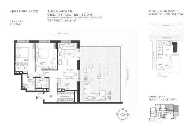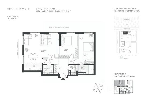 Продается 3-к квартира площадью 112.2 кв.м. на 14-м этаже в ЖК "Клубный квартал Крылатская 33". Прямая продажа от застройщика! Крылатская 33 - проект премиум-класса на западе Москвы от специализированного застройщика "Сияние". Комплекс расположен всего в 15 минутах от Садового кольца и Москва-Сити, а рядом есть большое количество зелёных зон: Крылатский и Москворецкий парки, Серебряный бор, Крылатские холмы - это создает идеальный баланс между приватностью и динамичным ритмом мегаполиса. Квартал сочетает высотные башни до 150 метров и камерные малоэтажные корпуса. Витражное остекление "в пол" наполняет квартиры светом и открывает захватывающие панорамы на Москву-реку и знаковые виды столицы. Здесь каждый найдет то, что подходит именно ему - от уютных студий до роскошных пентхаусов и квартир с собственными террасами. Внутренняя среда жилого комплекса продумана до мельчайших деталей, чтобы резиденты могли продуктивно работать и качественно отдыхать, не покидая территорию: • фитнес-центр, включающий в себя СПА-зону; • коворкинг с кофейней и быстрым интернетом; • общественная гостиная для организации клубных мероприятий; • ресторан с панорамным остеклением; • благоустроенный сад с зоной отдыха; • инновационная игровая площадка для детей всех возрастов; • консьерж-сервис 24/7, современные системы видеонаблюдения и пожаротушения; • двухуровневый паркинг и многое другое. Район Крылатское - точка притяжения для тех, кто выбирает активный образ жизни. В непосредственной близости расположены Гребной канал, Олимпийский велотрек, горнолыжный комплекс "Лата Трэк", гольф-клуб и парковые зоны. В проекте действуют привлекательные условия покупки: - выгода до 10% при 100% оплате (действует на ограниченный пул квартир, подробности уточняйте в отделе продаж). - рассрочка от застройщика 0% с первоначальным взносом от 20% на срок до 30.06.2027.