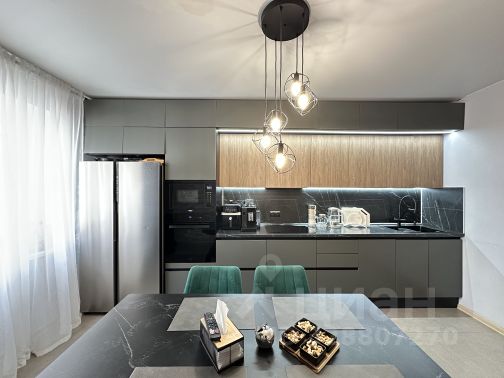Кухня гостиная: оснащена столешницей, на полу и в зоне фартука крупноформатный керамогранит, оборудован остров. В гарнитур встроены варочная панель, духовка и микроволновка фирмы MAUNFELD, вытяжка, стиральная и сушильные машины фирмы АSKO, холодильник INDESIT, система очистки питьевой воды Барьер. Столешница и остров из акрилового камня с вкраплением серебряных нитей. Ручки металлические модерн матовые никель. Фурнитура BLUM. ТВ зона со стеклянным гарнитуром, зонирована фрезерованной рифленой панелью в стиль верхних фасадов кухни (одна панель стоила 120 000 в 2024 году). Стеклянные колонны с доводчиками немецкого профиля RAUMPLUS с подсветкой и полочками. Мягкие кресла.